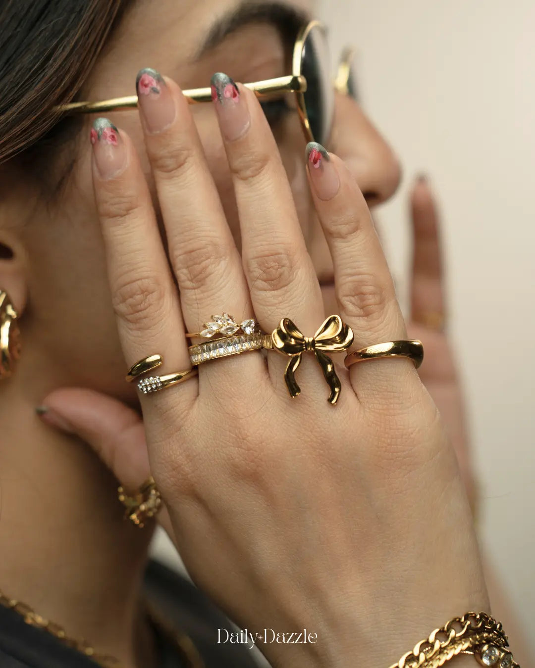 Make a bold and beautiful statement with the Statement Bow Ring — a larger-than-life accessory designed to turn heads. Featuring an oversized, sculpted bow design and finished in brilliant 18K gold plating, this ring adds a playful yet elegant flair to any outfit. Its adjustable band ensures a perfect fit for all sizes.