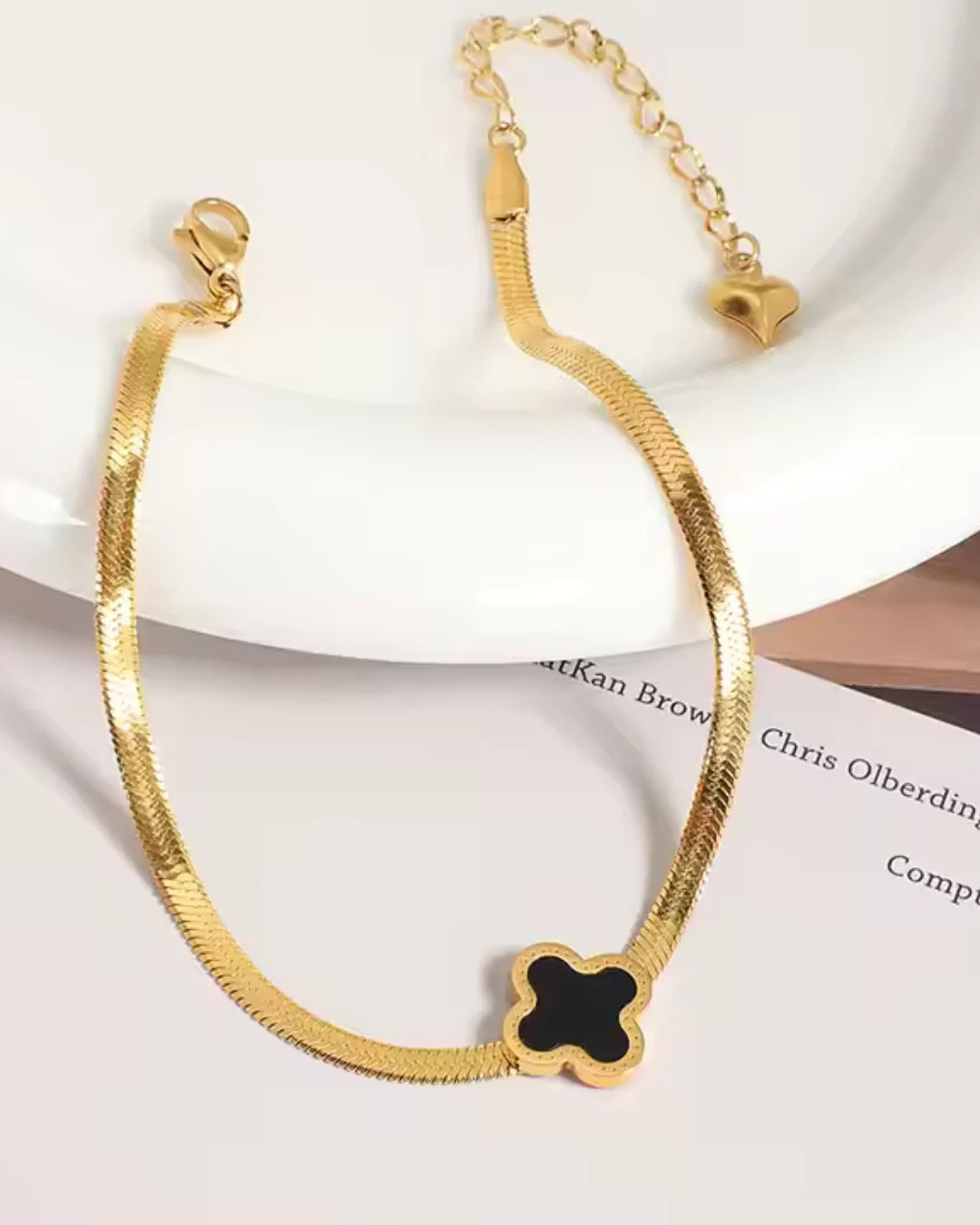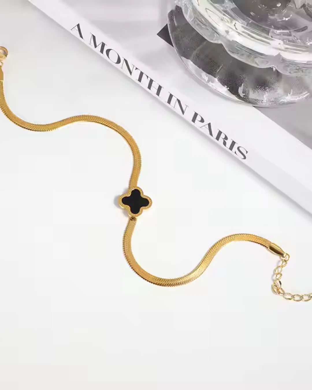 Featuring a sleek 18K gold-plated herringbone chain and a delicate black clover pendant, this piece exudes grace and elegance.