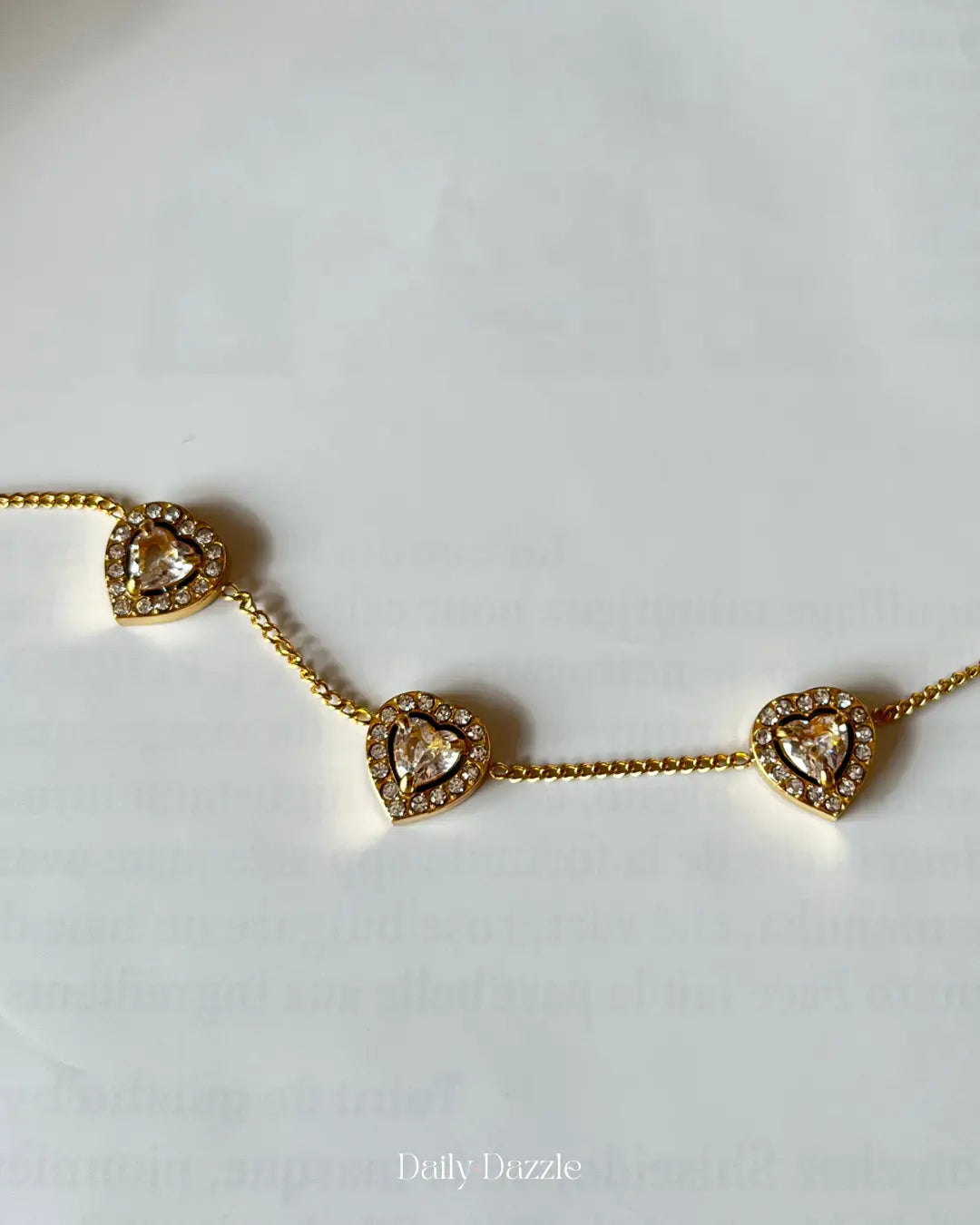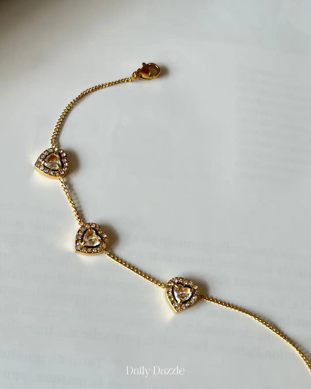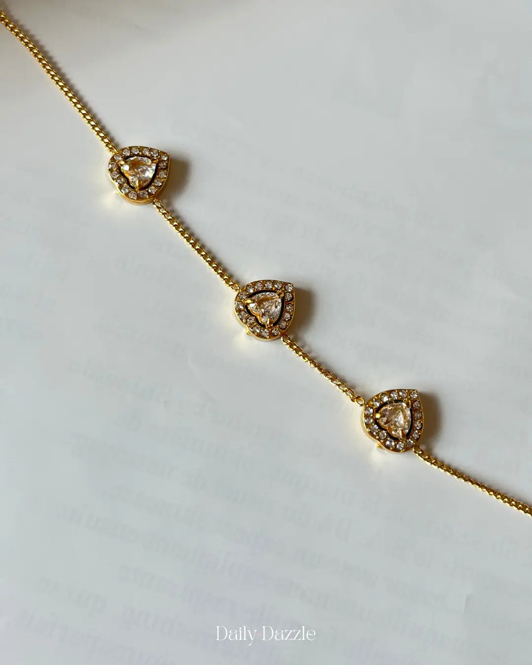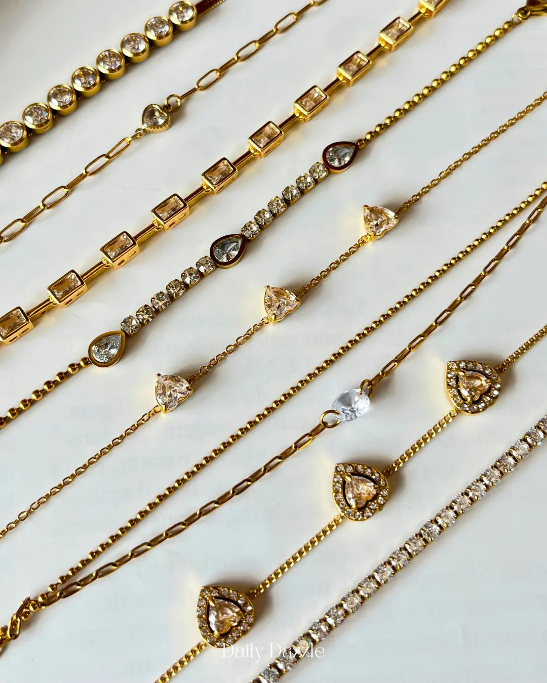 Delicate yet dazzling, the Celeste Drops Bracelet is a true showstopper. Adorned with teardrop-shaped center stones embraced by a halo of tiny sparkling crystals, this piece captures the elegance of starlight caught in gold.