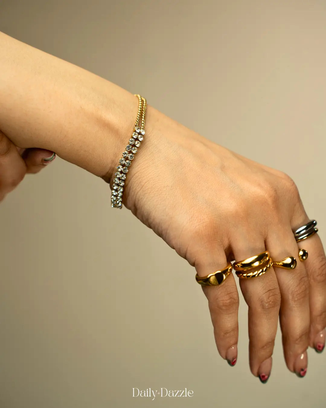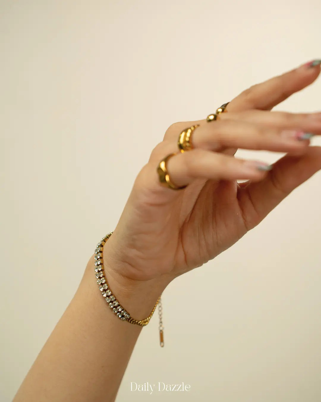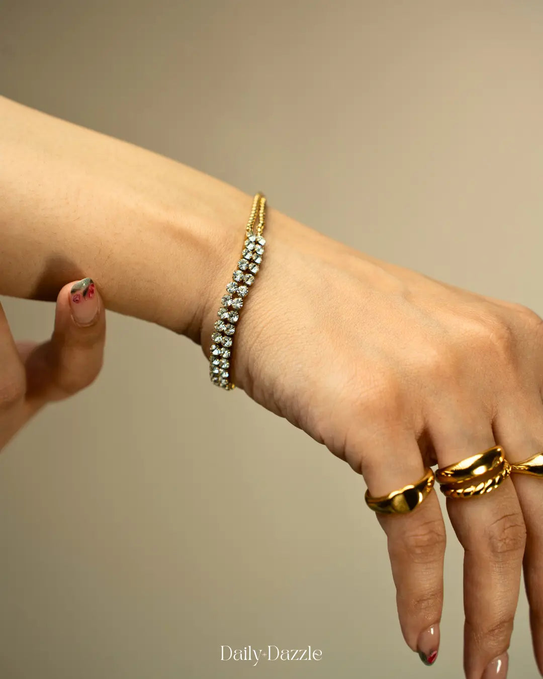 Shimmer with elegance in our Dazzle Bracelet, a radiant piece designed to light up your look. Featuring a double row of dazzling crystals set on a sleek, dual-chain design, this 18K gold plated, anti-tarnish bracelet blends timeless charm with modern sophistication. The adjustable clasp ensures a perfect fit, making it ideal for both everyday dazzle and special occasions.