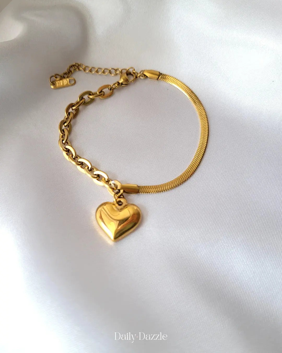 Fall in love with bold elegance — our Golden Heart Chain Bracelet is the perfect blend of modern edge and timeless charm. Featuring a striking 18K gold-plated puffed heart pendant suspended from a dual-texture bracelet, it brings together a sleek herringbone band and bold chain links for a statement finish.