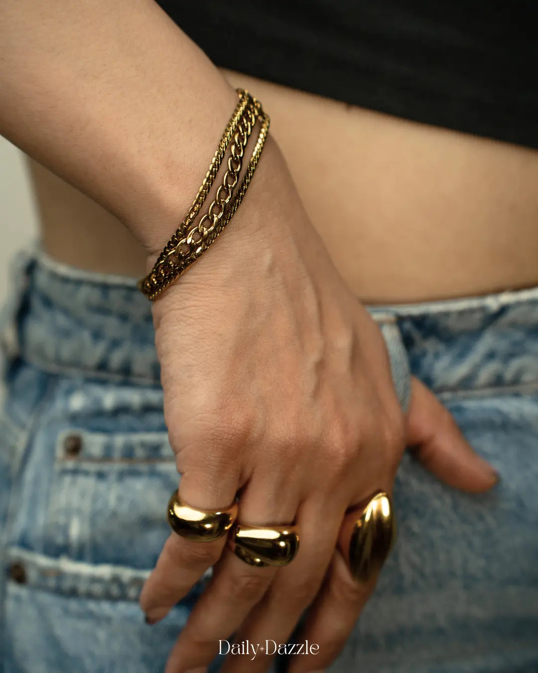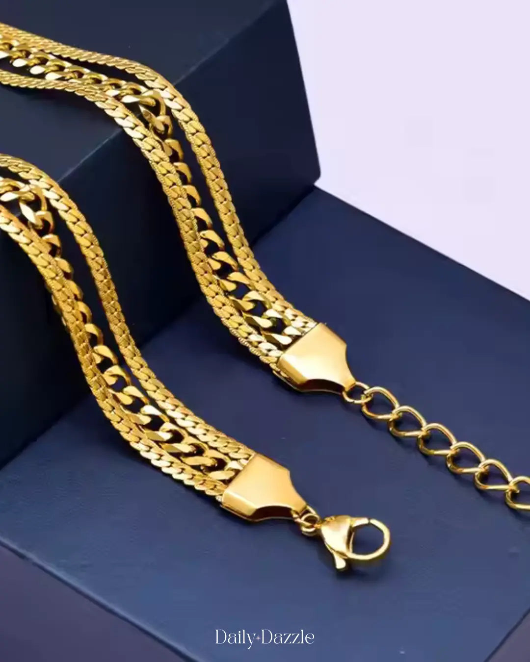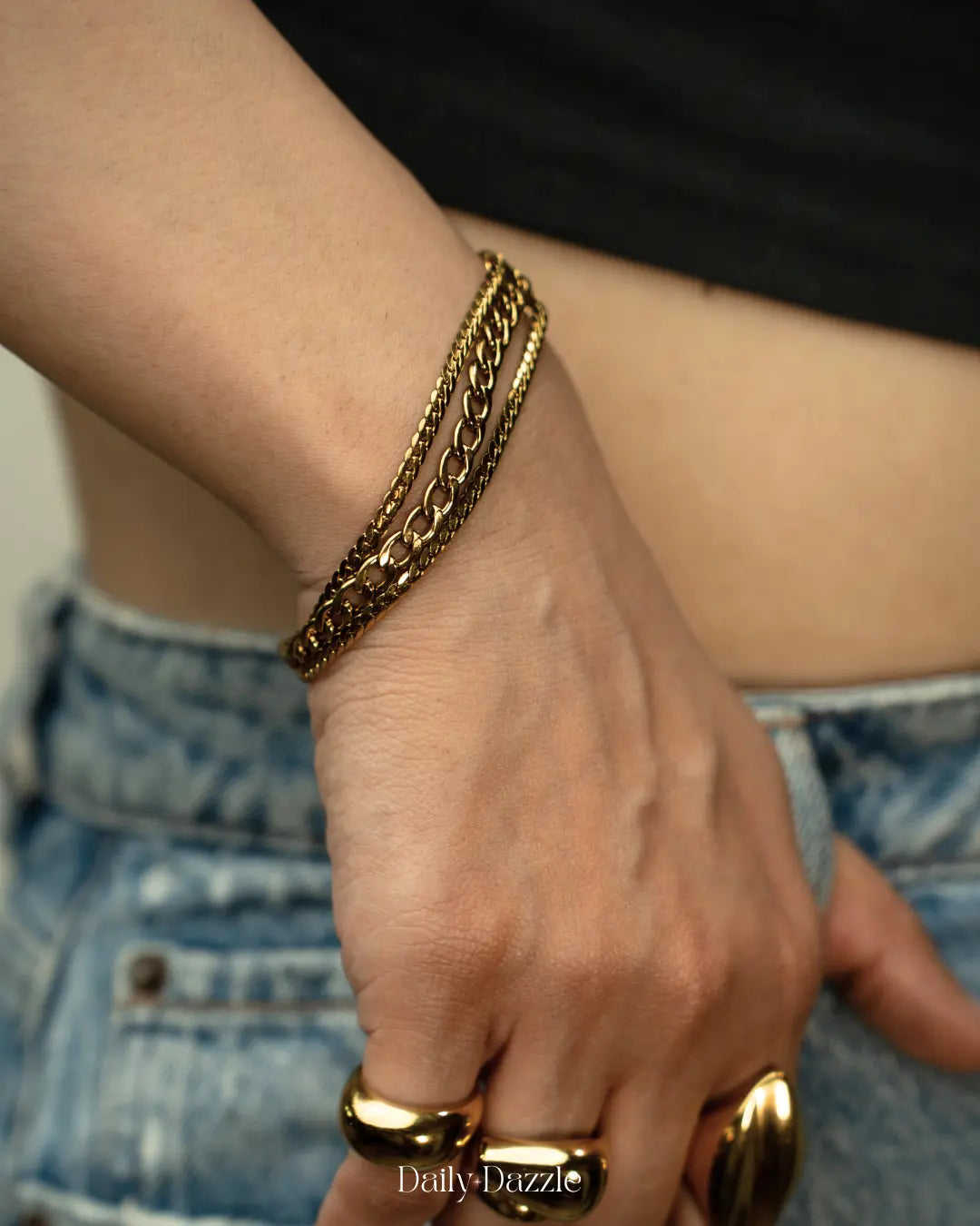 Upgrade your everyday with our Layered Luxe Bracelet, a striking fusion of boldness and elegance. This piece features a trio of distinct chain styles, expertly layered into one seamless statement—perfect for adding instant polish to any outfit. Crafted with premium 18K gold plating, it's designed to resist tarnishing and keep its rich golden glow wear after wear.