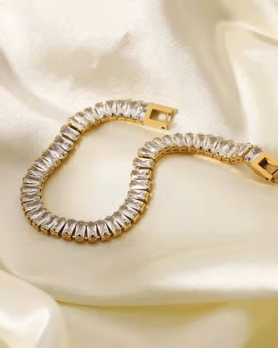 Dazzle with elegance in the Radiance Baguette Bracelet – a timeless piece designed to turn heads. Featuring luxurious baguette-cut stones set in 18K gold-plated, anti-tarnish metal, this bracelet delivers unmatched brilliance and sophistication.