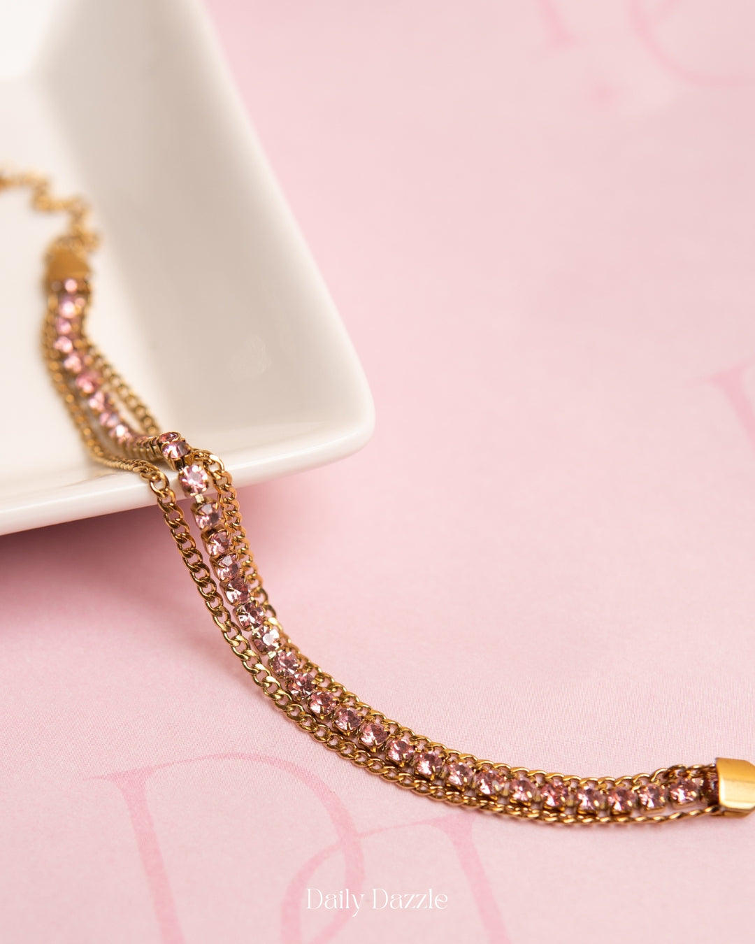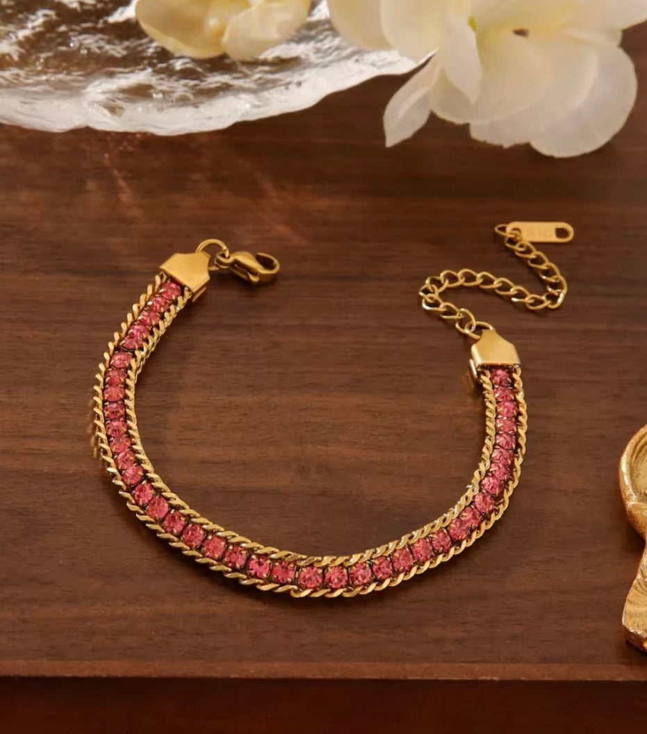 Add a touch of elegance to your everyday style with this 18K gold-plated pink tennis chain bracelet. Featuring a dazzling row of pink cubic zirconia stones set in a classic gold-plated Cuban link chain, this piece offers a perfect blend of boldness and sophistication. The adjustable length (17+5 cm) ensures a comfortable fit for any wrist.