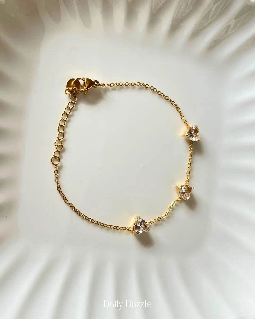 Sweet, subtle, and endlessly charming — the Triple Heart Sparkle Bracelet features three delicate heart-shaped crystals that glisten with every move. Set on a fine gold chain, this bracelet adds a soft romantic glow to your wrist, perfect for everyday wear or a hint of shimmer on special occasions.