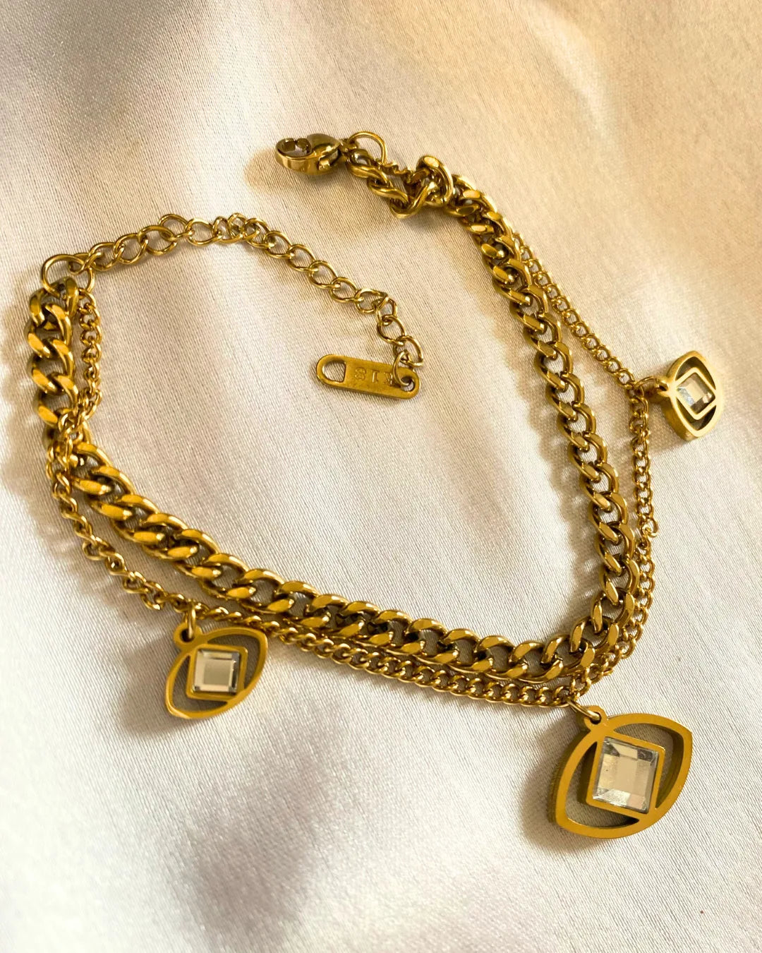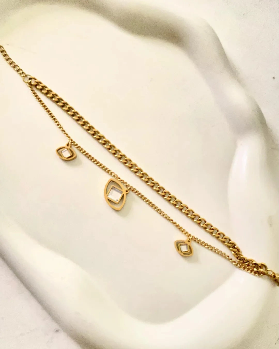 Featuring dual-layered 18K gold-plated chains adorned with crystal-accented charms, this bracelet is the perfect blend of luxury and sophistication.