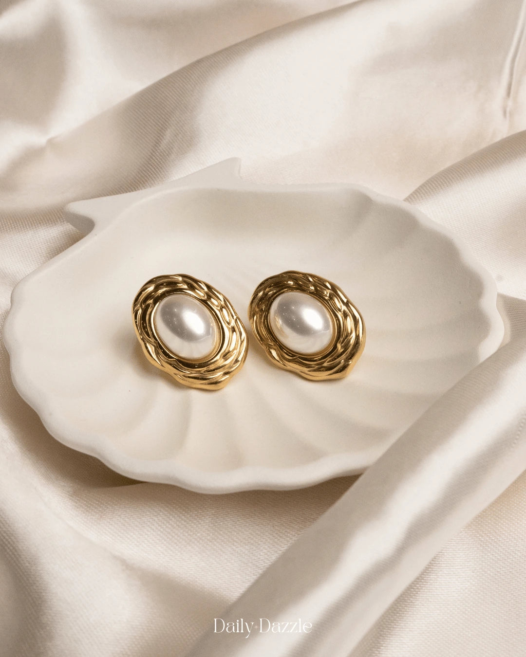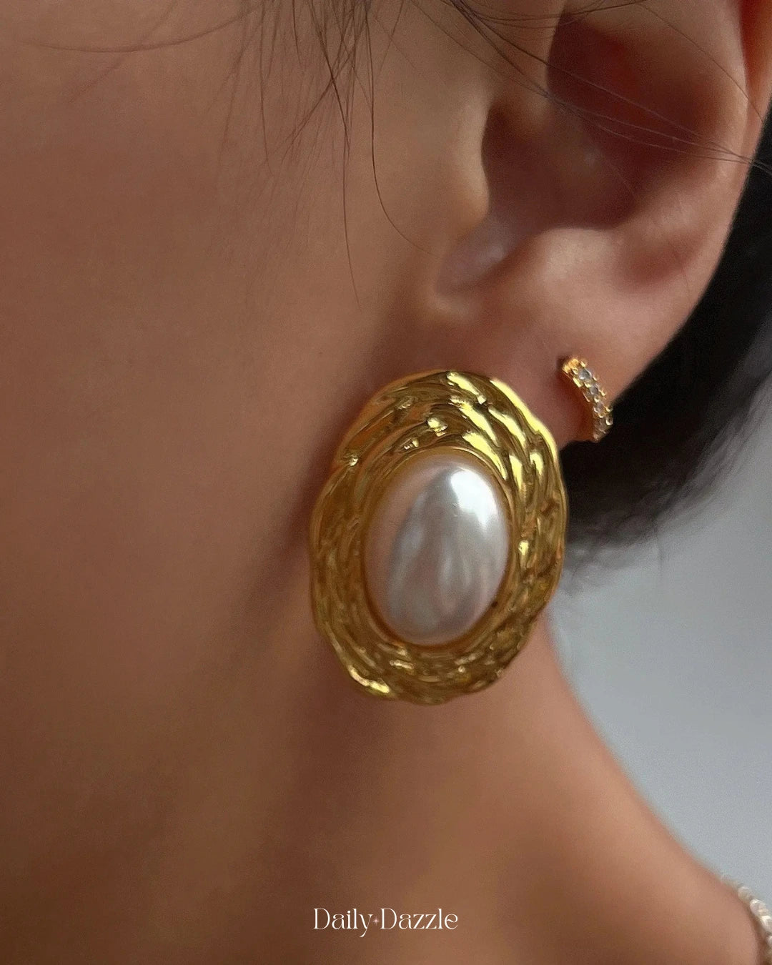 Drape your ears in timeless charm with our Golden Radiance Pearl Earrings. Featuring a lustrous oversized pearl set in a textured 18K gold-plated frame, these earrings bring a touch of artistry to your look.