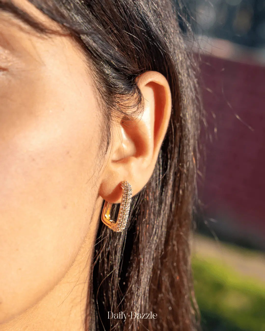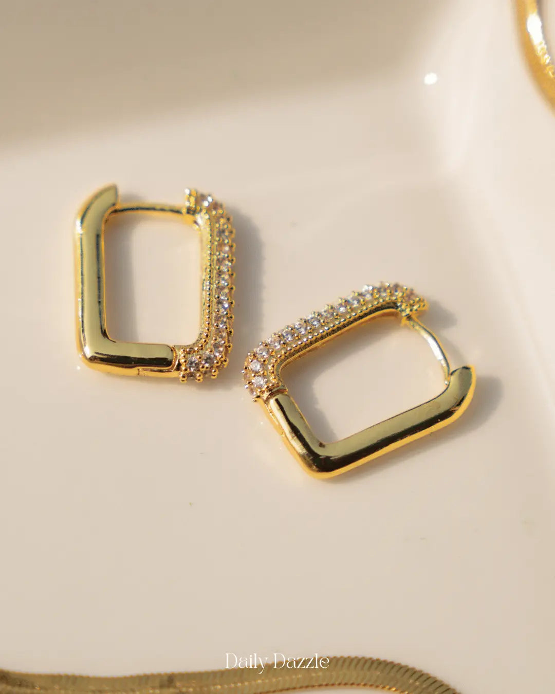 These sleek, 18K gold-plated, anti-tarnish square hoops redefine elegance with a contemporary twist. The dazzling pavé crystals on one side add just the right amount of sparkle, while the geometric shape keeps it effortlessly chic. Lightweight yet bold, these earrings are perfect for elevating both casual and dressy looks.