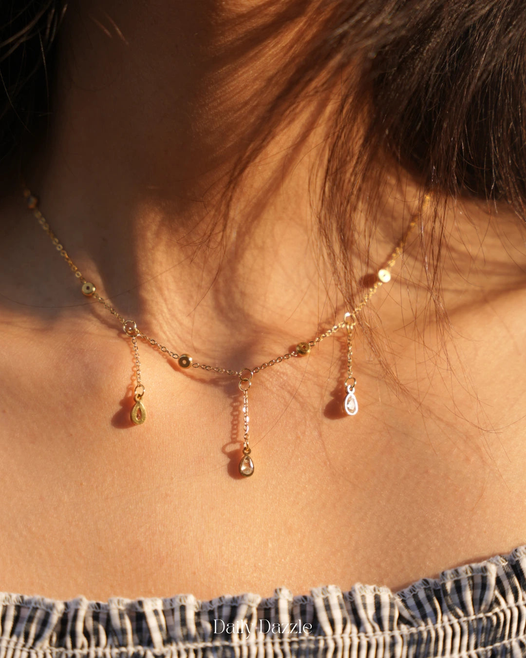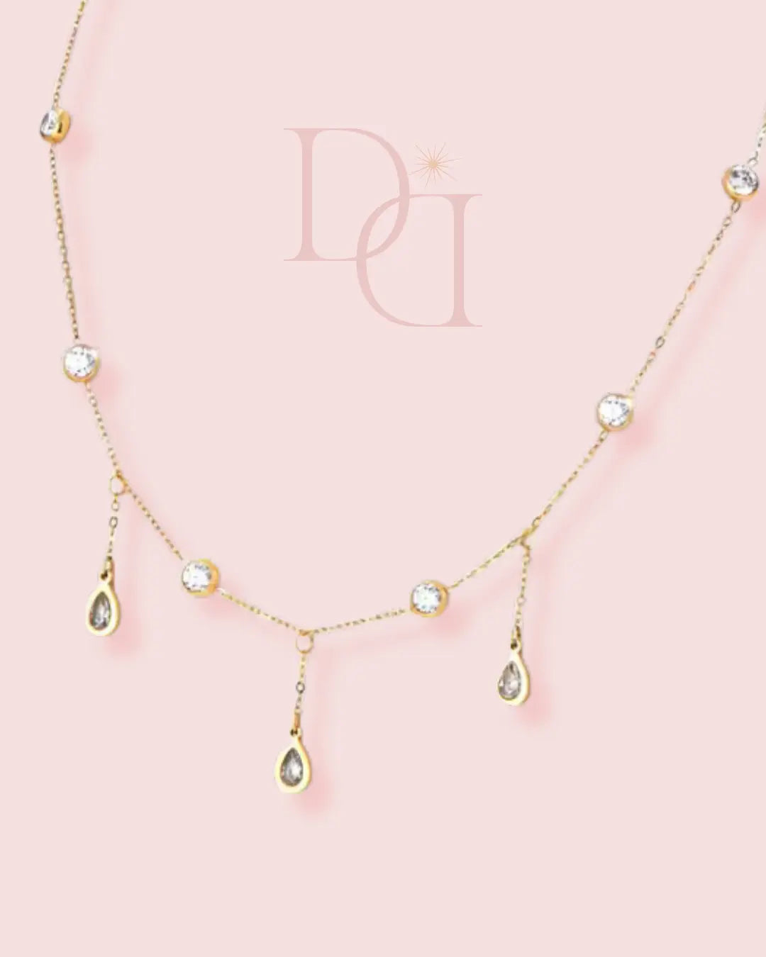 Featuring a delicate 18K gold-plated chain, adorned with bezel-set cubic zirconia stones and graceful teardrop charms, this necklace is the perfect blend of sophistication and glamour.