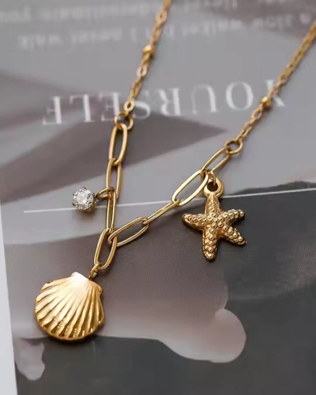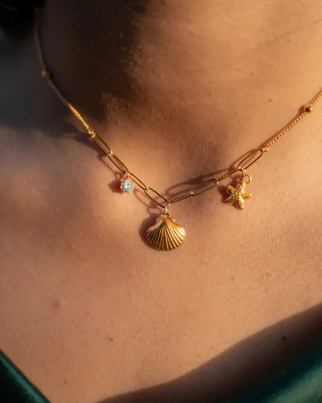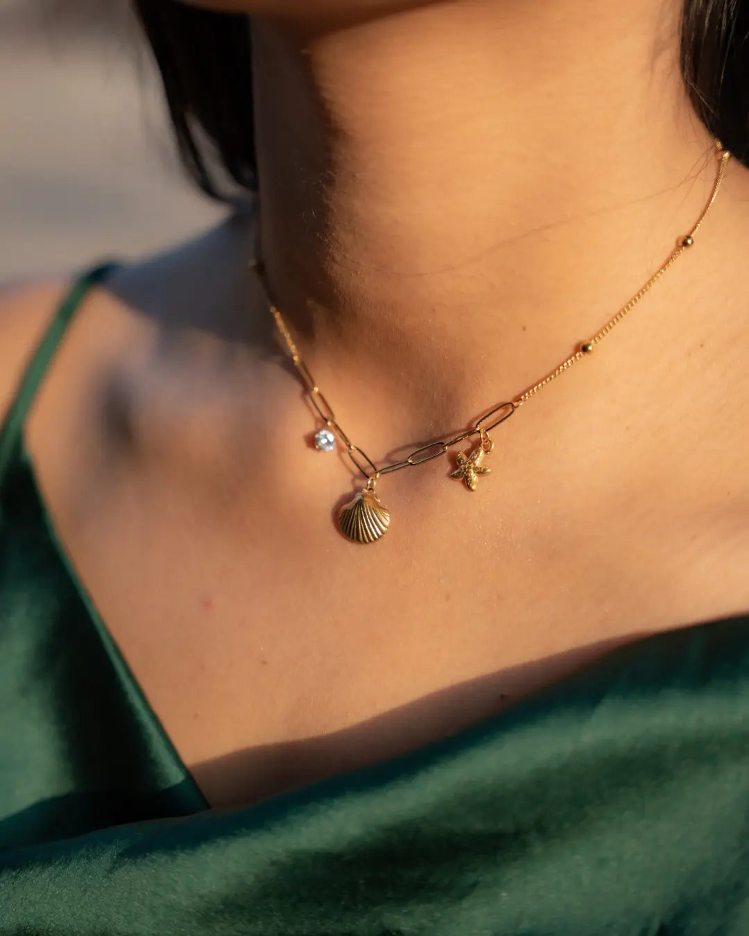 Inspired by the beauty of the ocean, the Golden Seashell Charm Necklace features a delicate layered chain adorned with a seashell, starfish, and a sparkling crystal charm.