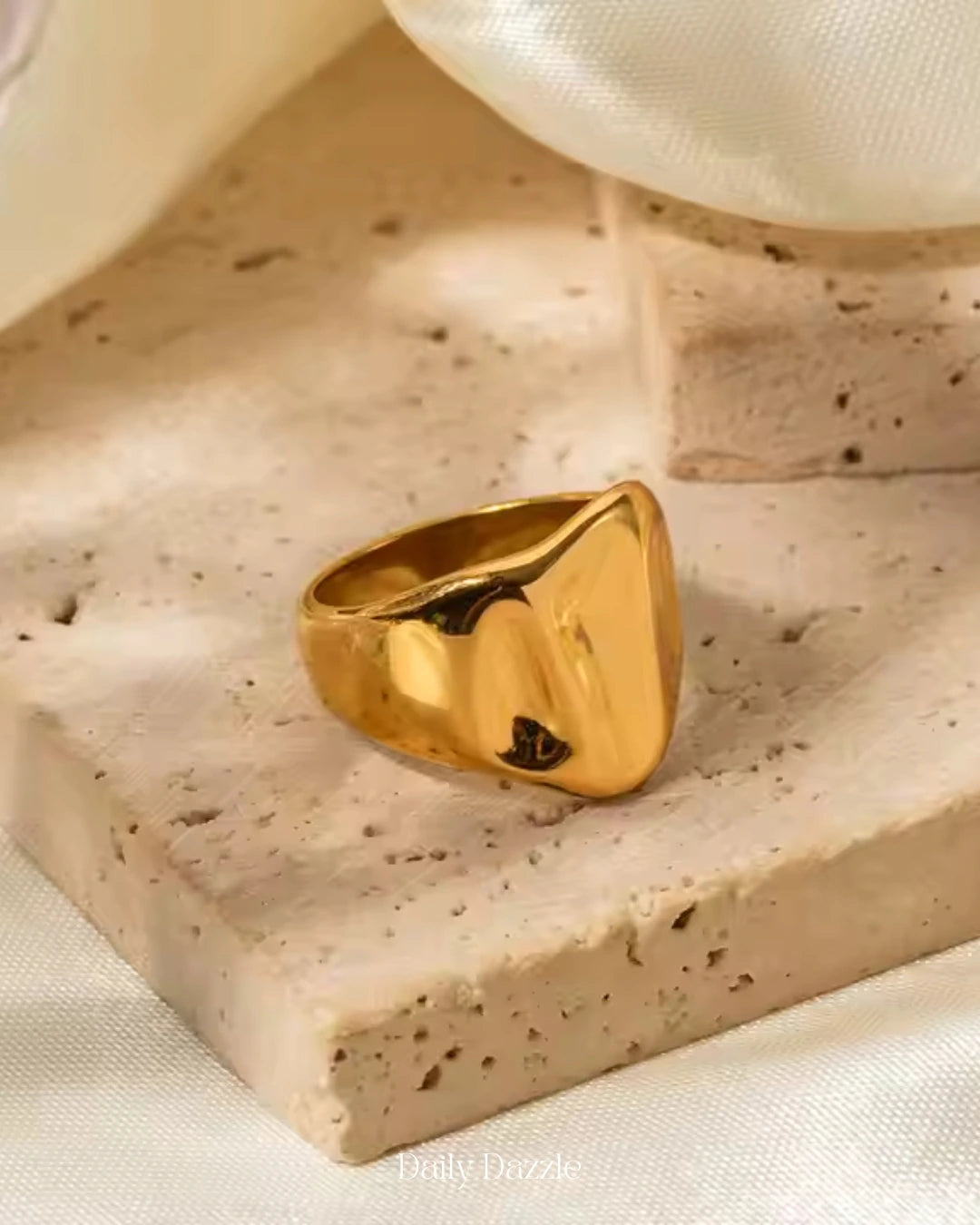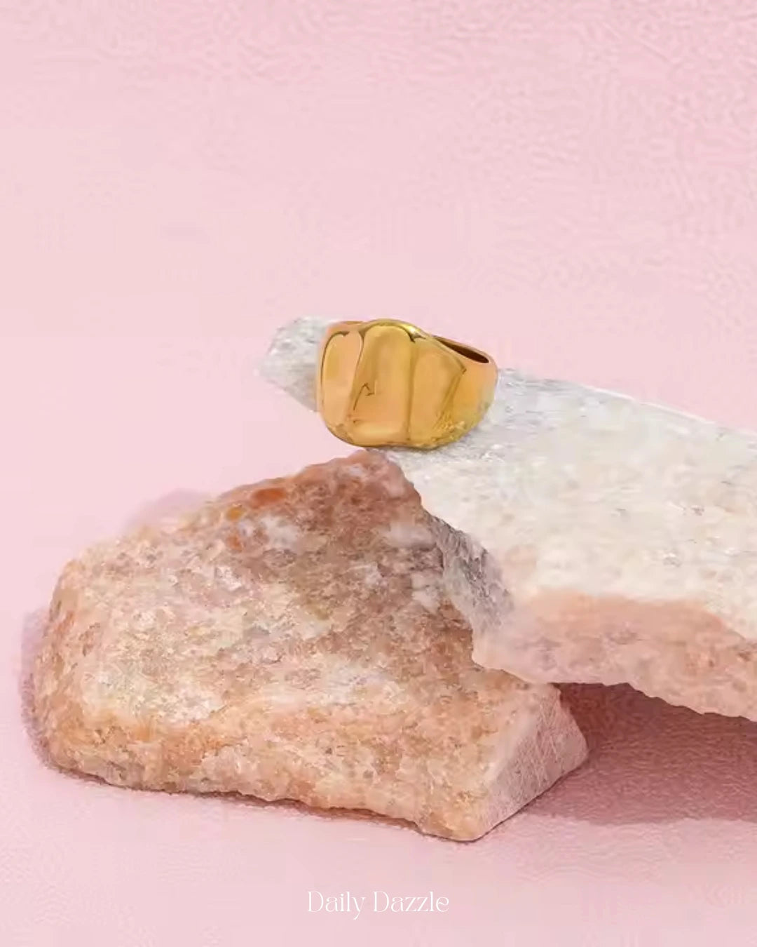 Striking, modern, and effortlessly chic—the Auric Wave Ring is a statement of artistic elegance. Designed with a fluid, organic shape, this anti-tarnish, 18K gold-plated ring showcases a sculpted, molten-like texture that adds a touch of contemporary luxury.