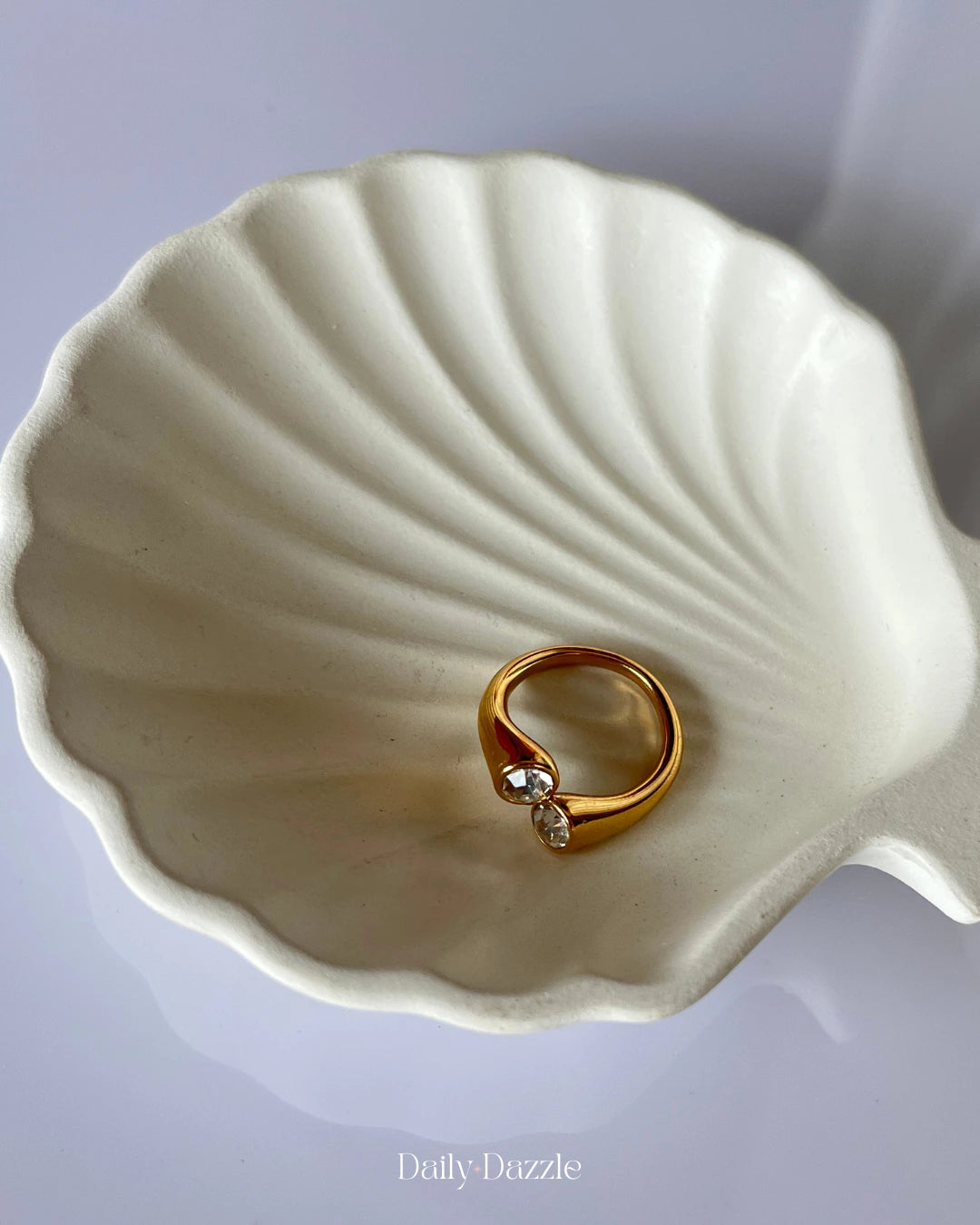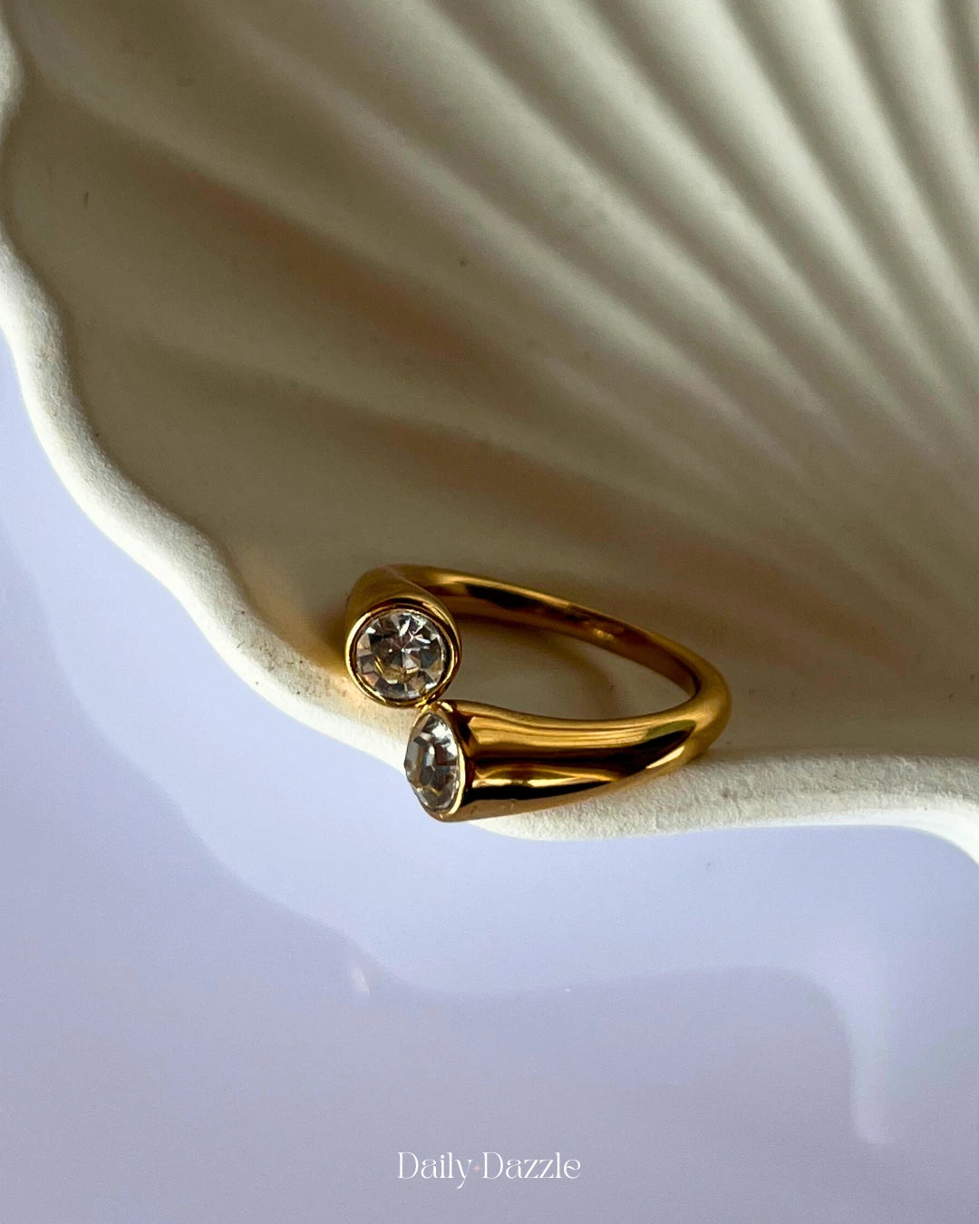 A sleek and modern open band ring that features two sparkling crystals facing each other—simple, stylish, and designed to catch the light just right. Plated in 18K gold and crafted with anti-tarnish technology, this ring brings a quiet elegance to your everyday look.