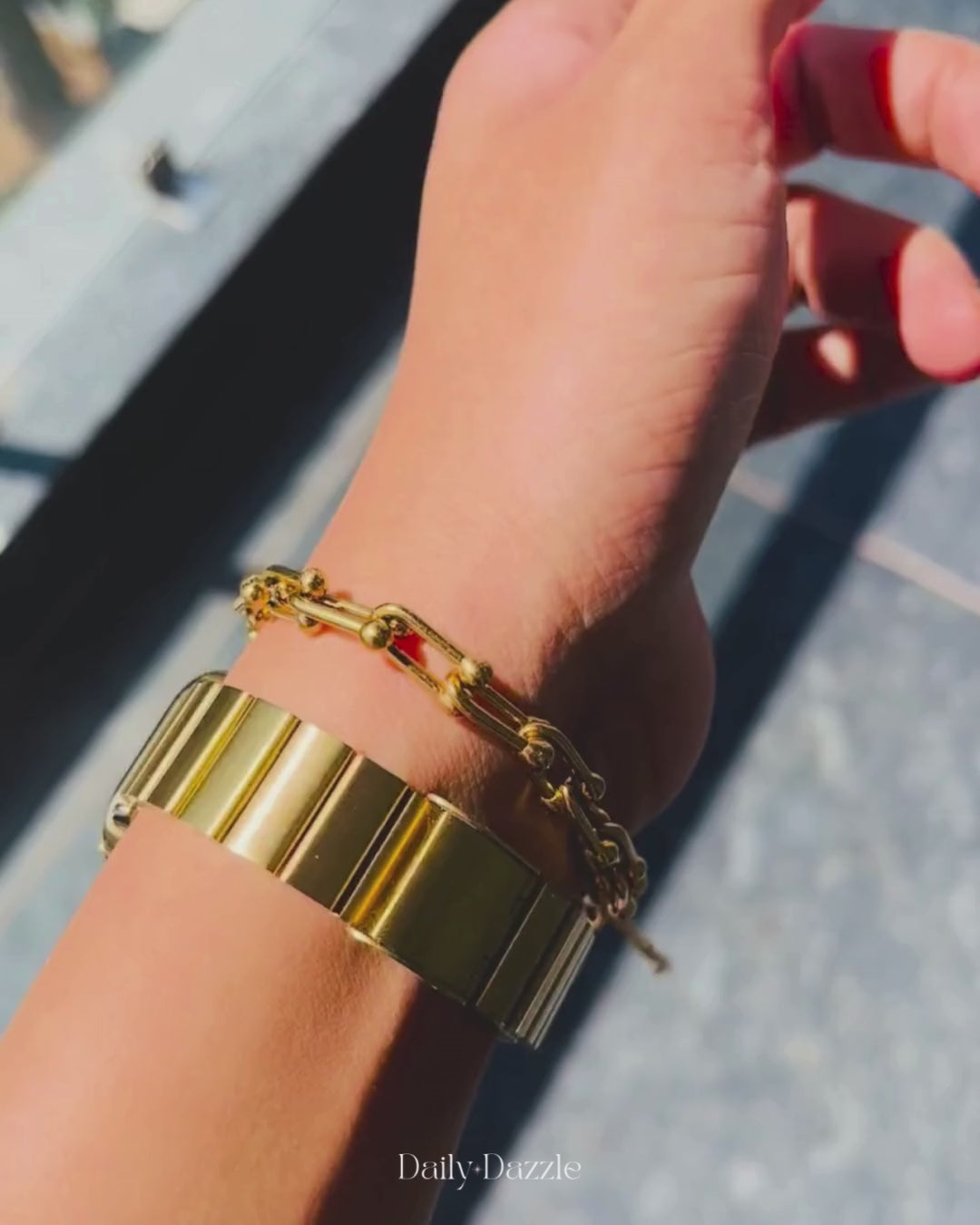 Crafted with anti-tarnish 18K gold plating, this statement piece features a modern link design with delicate bead detailing. Perfect to wear solo for a minimal look or stack it up with other favorites for a layered vibe.