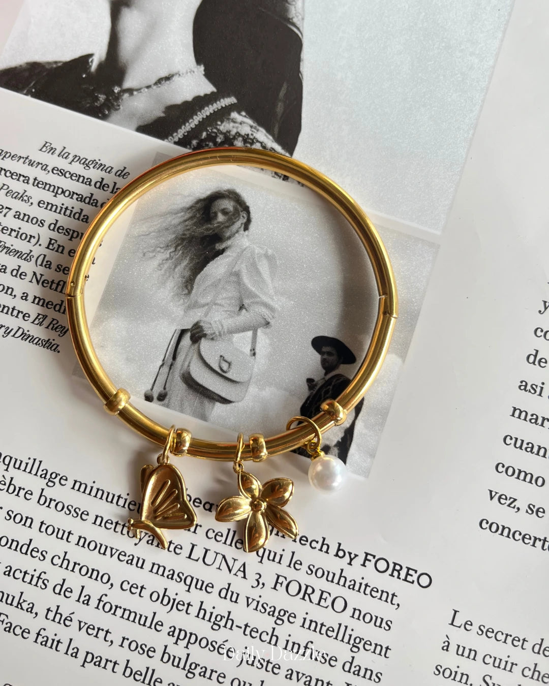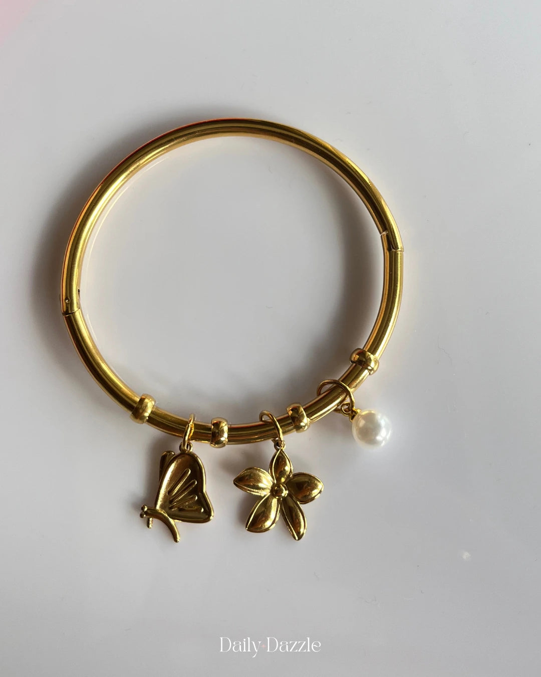 Delicate, charming, and nature-inspired — the Butterfly Bloom Bangle features graceful gold-toned charms of a butterfly, flower, and a single lustrous pearl. This bangle captures the essence of spring in a minimal, modern silhouette. Openable from one side.