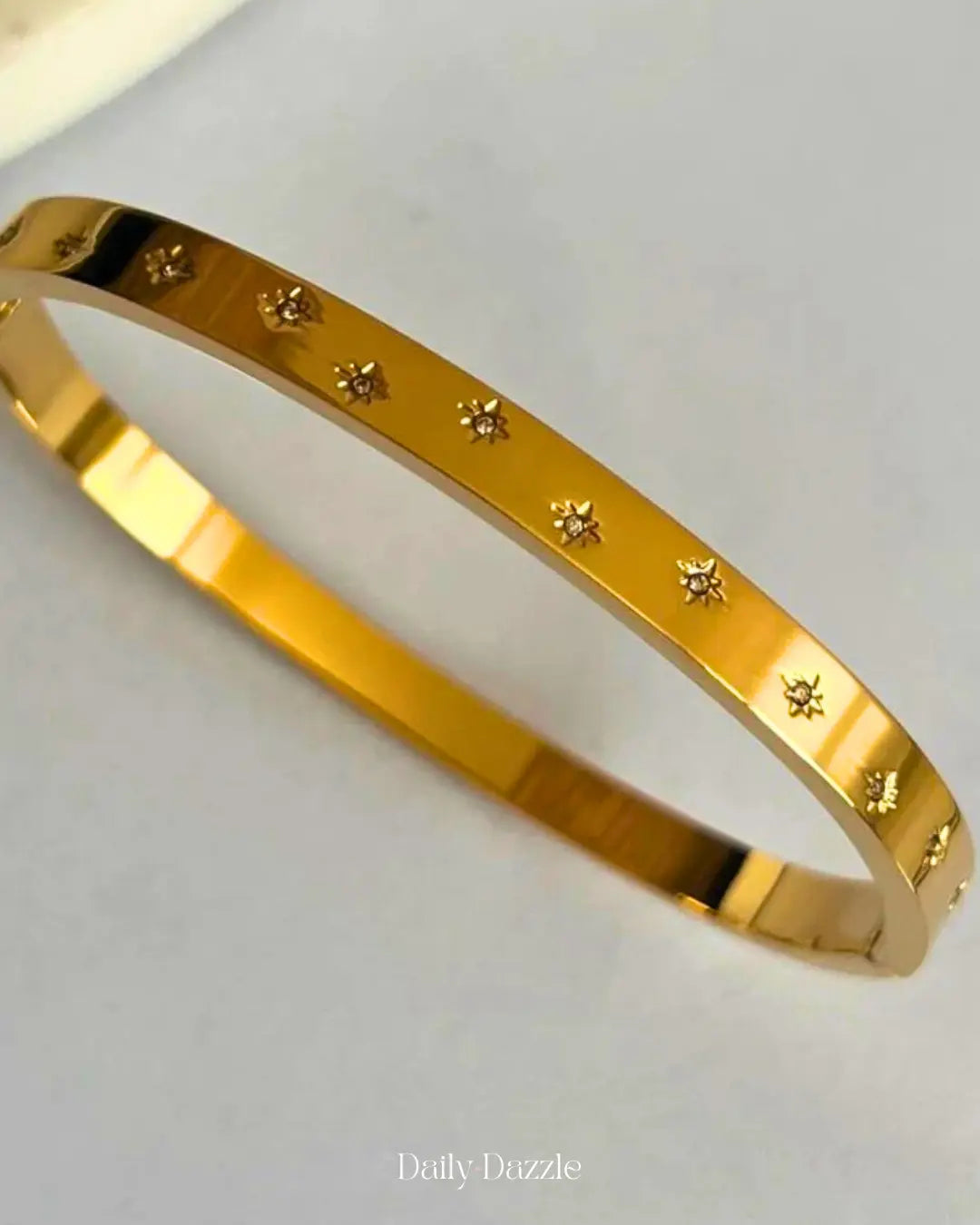 This elegant bangle from Daily Dazzle is plated with 18K gold and features small engraved star designs with tiny stone accents. Its clean and minimal look makes it perfect for daily wear or special occasions.