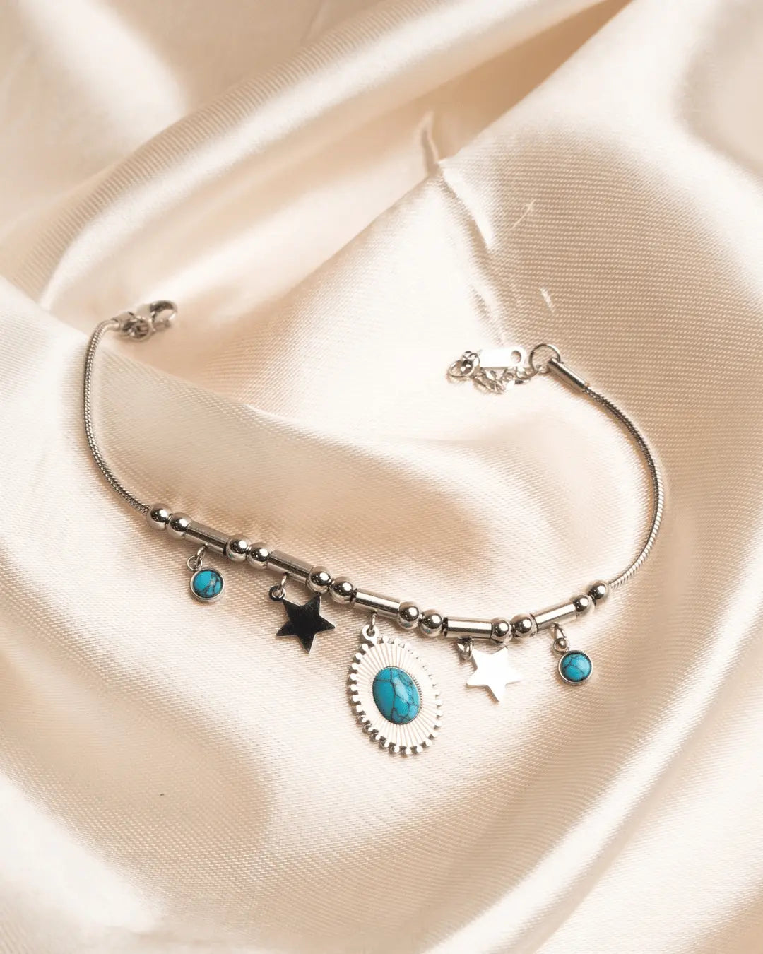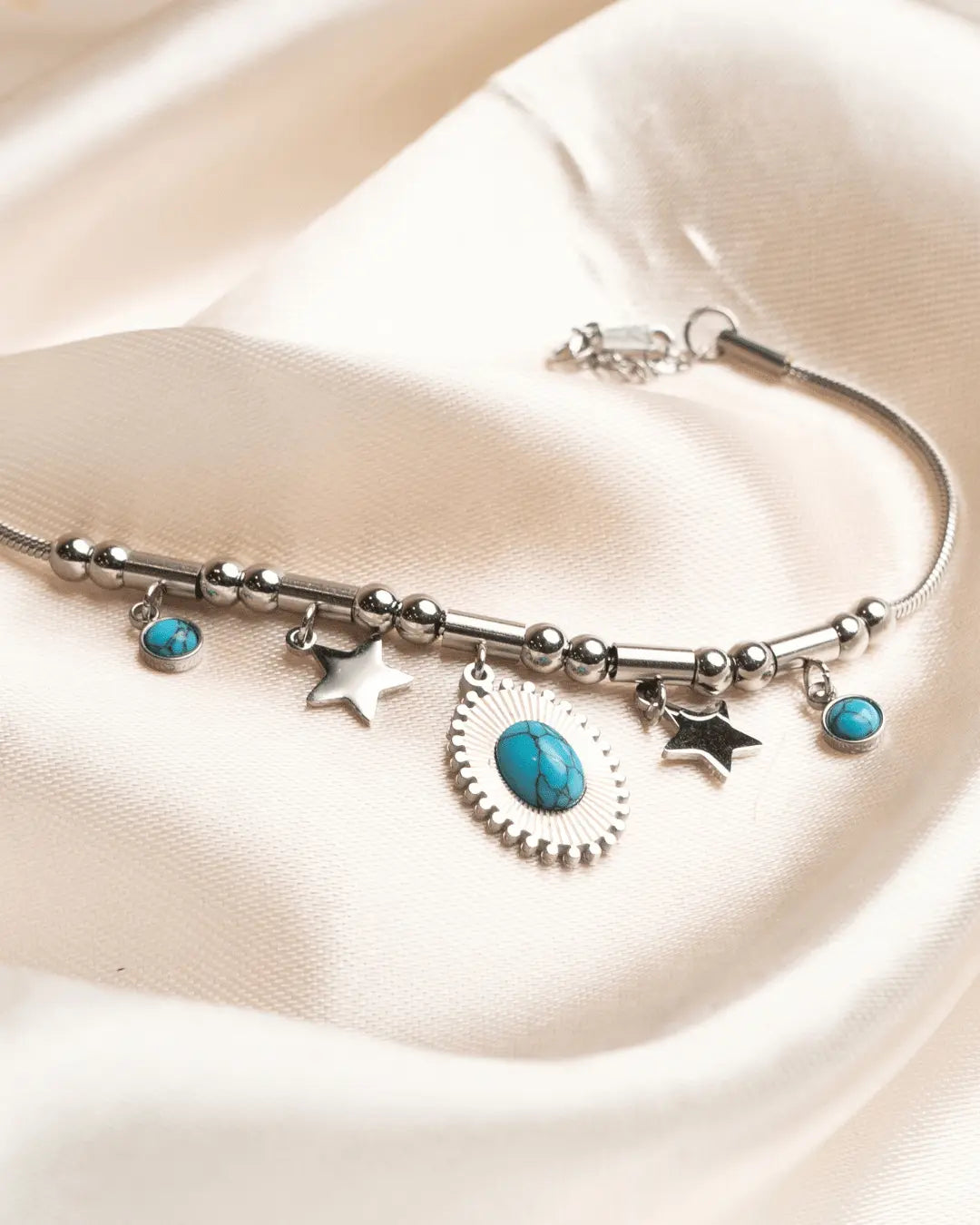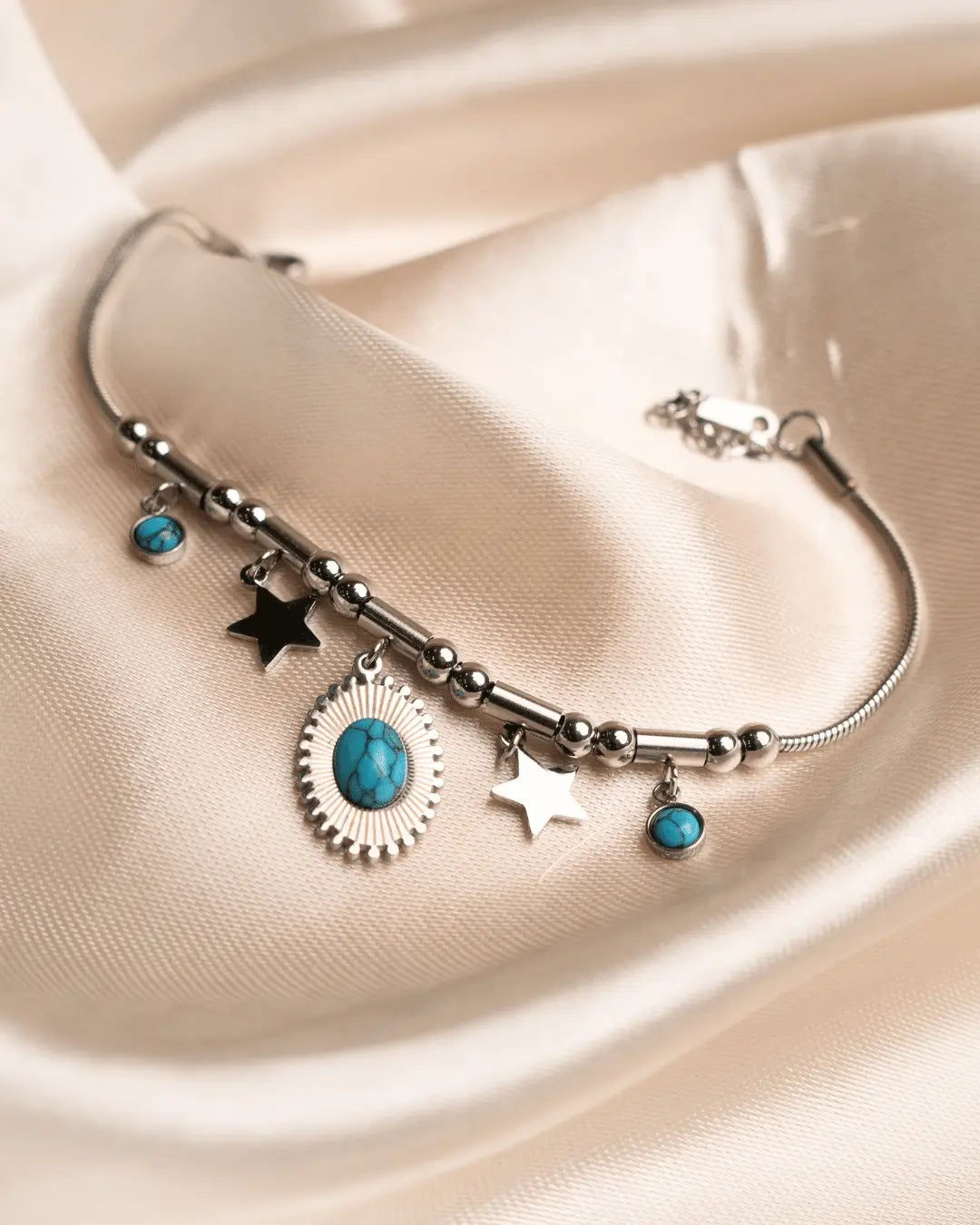 A delicate yet bold piece inspired by the beauty of the stars. Crafted in high-quality silver plating, this anti-tarnish bracelet features an adjustable snake chain adorned with turquoise accents and celestial charms.
