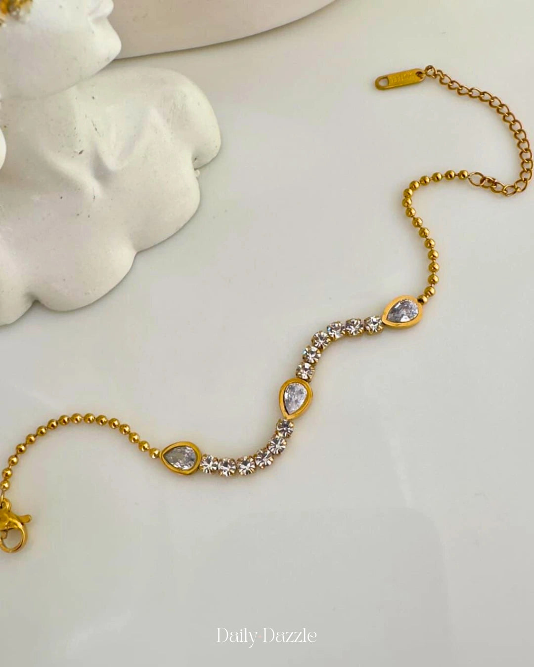 Refined, radiant, and effortlessly elegant—the Delicate Bracelet is designed to dazzle. Featuring a delicate curve of round and teardrop-shaped cubic zirconia stones, this bracelet is expertly crafted with an 18K gold-plated finish and anti-tarnish coating for long-lasting beauty. Whether worn alone or layered, it's the perfect finishing touch to any outfit.