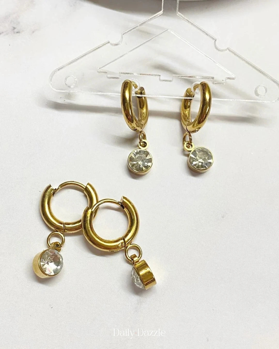Add effortless charm to your everyday look with the Drop Hoops — a perfect blend of simplicity and sparkle. These minimalist huggie-style hoops feature a dazzling round-cut cubic zirconia charm that gently dangles, catching the light with every move. Crafted with radiant 18K gold plating and an anti-tarnish finish, they're made to keep their shine day after day.