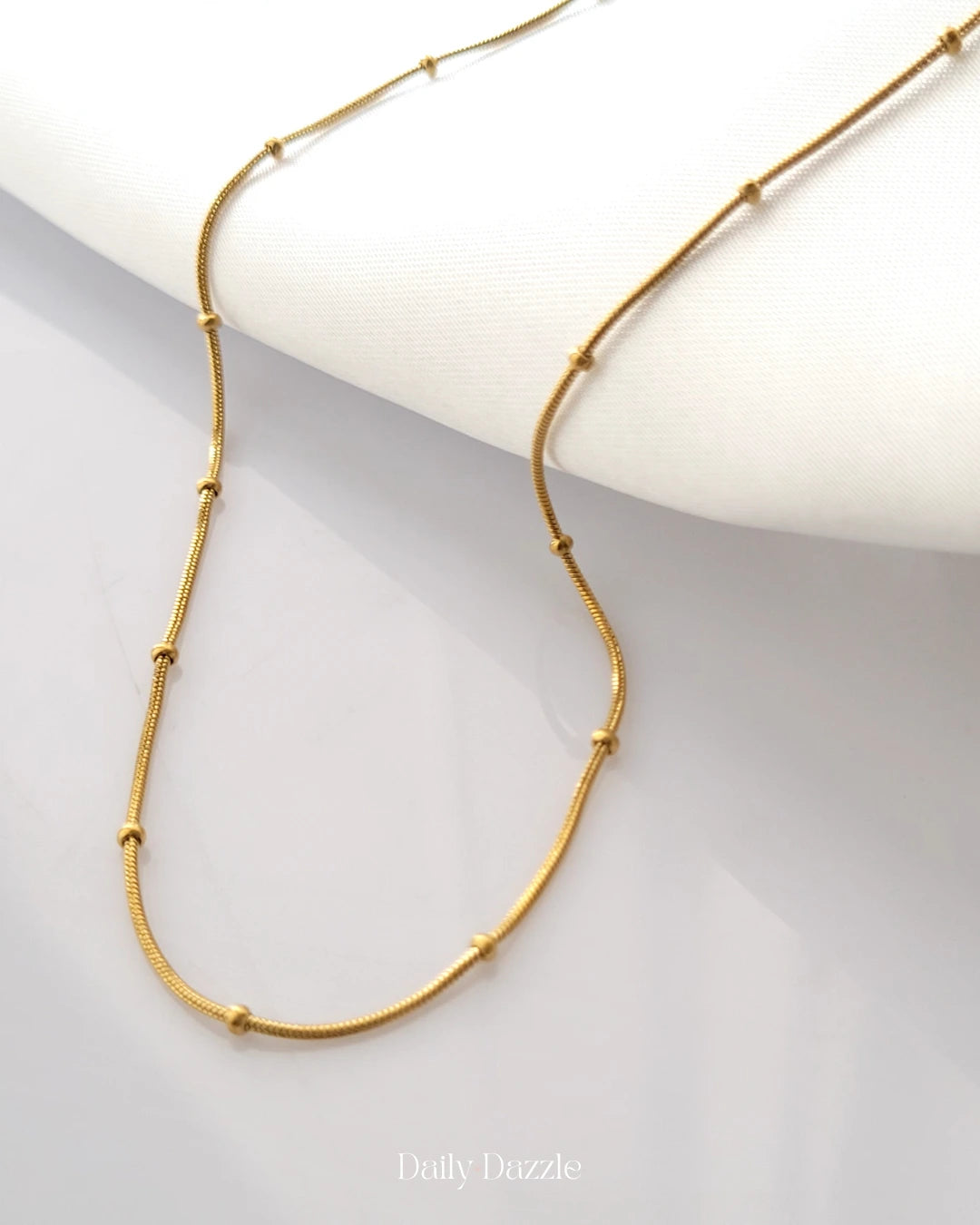 Minimal yet striking, the Dune Chain Necklace features a sleek snake chain design punctuated with tiny gold stations for a modern twist. Its fluid form hugs the neckline with ease, making it the perfect everyday essential — elegant on its own, stunning when layered.
