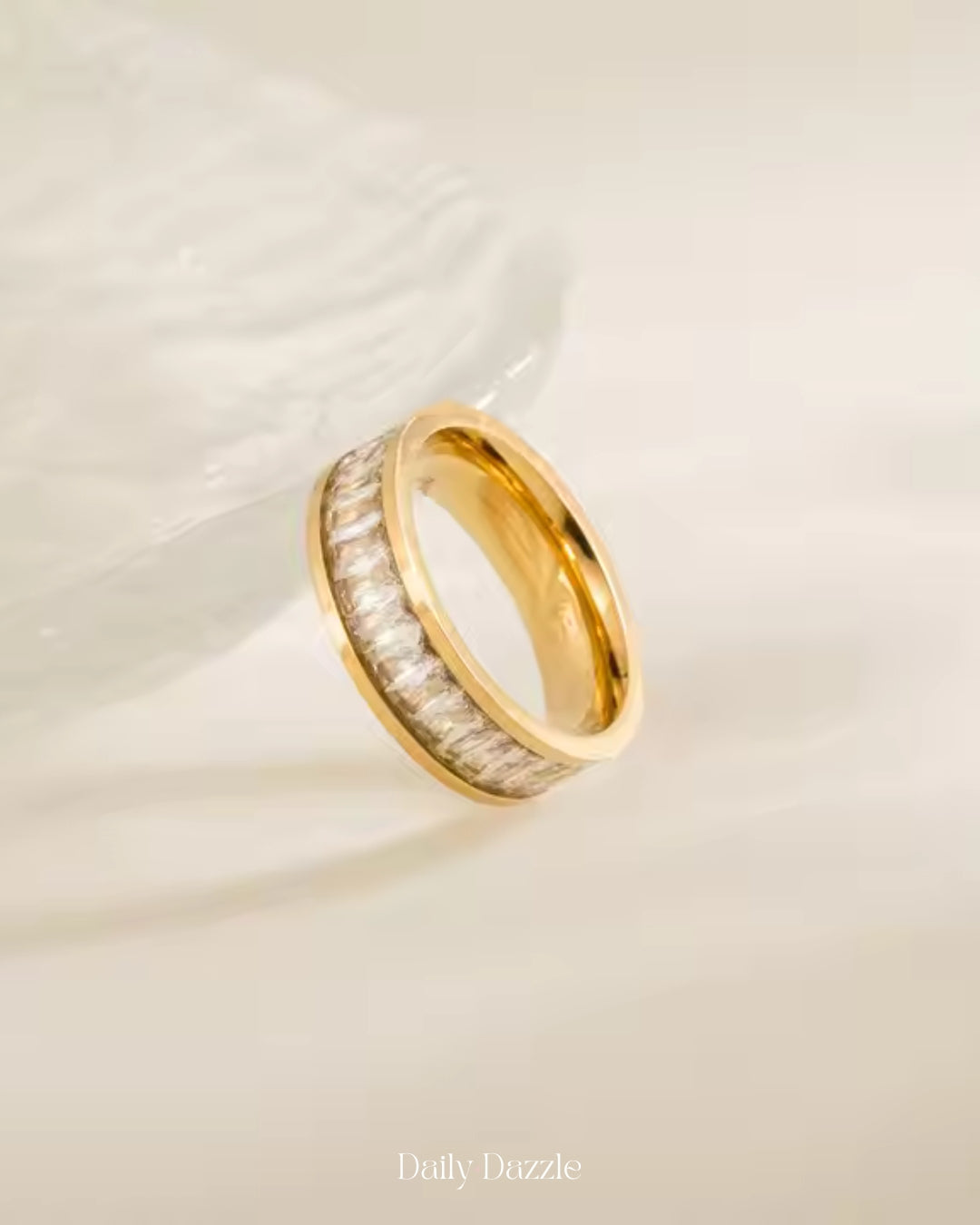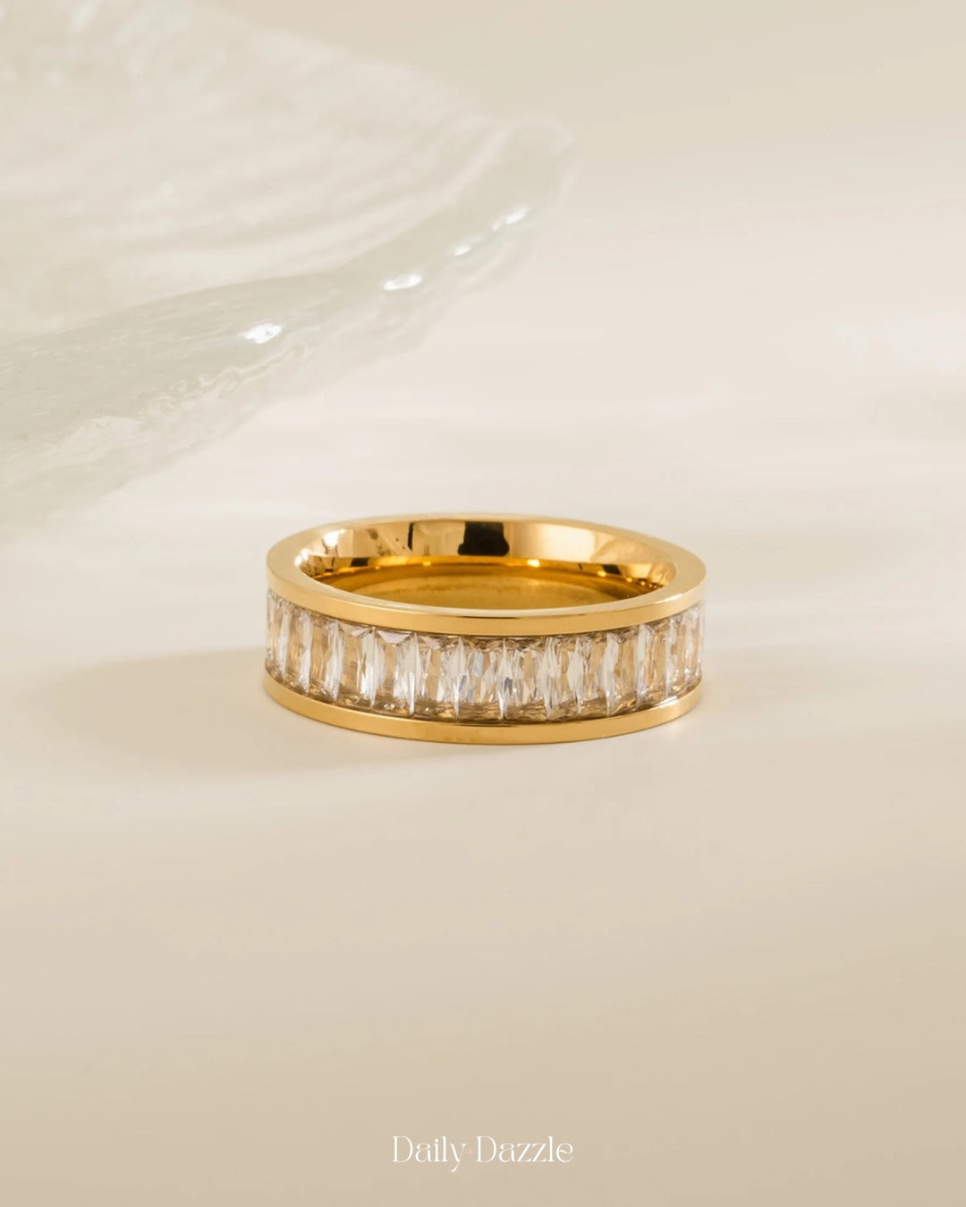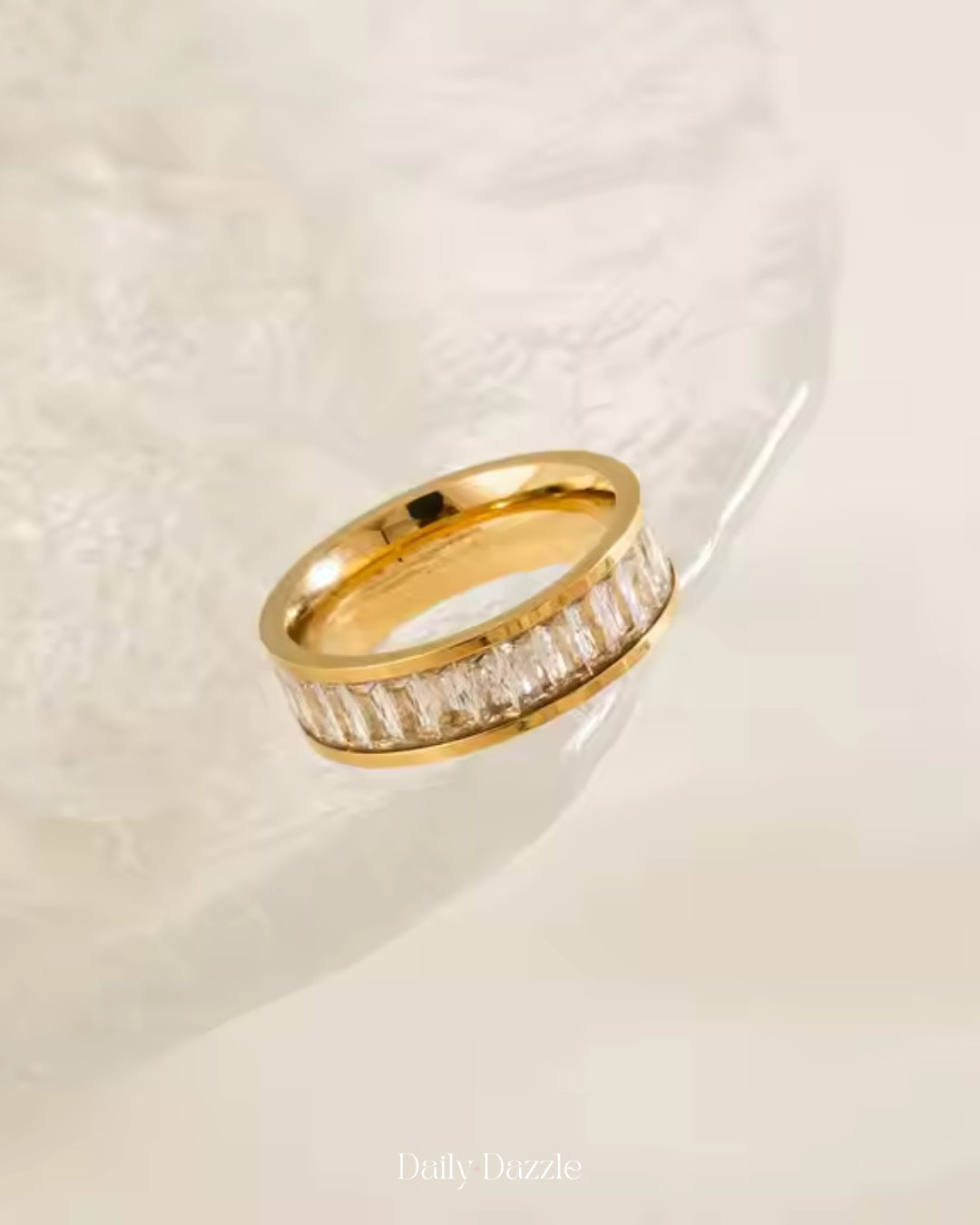 Sleek, sophisticated, and endlessly radiant—the Eternity Luxe Band is designed to make a statement. Crafted with precision, this ring features a stunning row of baguette-cut stones, set flawlessly within an anti-tarnish, 18K gold-plated band for a luxurious shine that lasts.