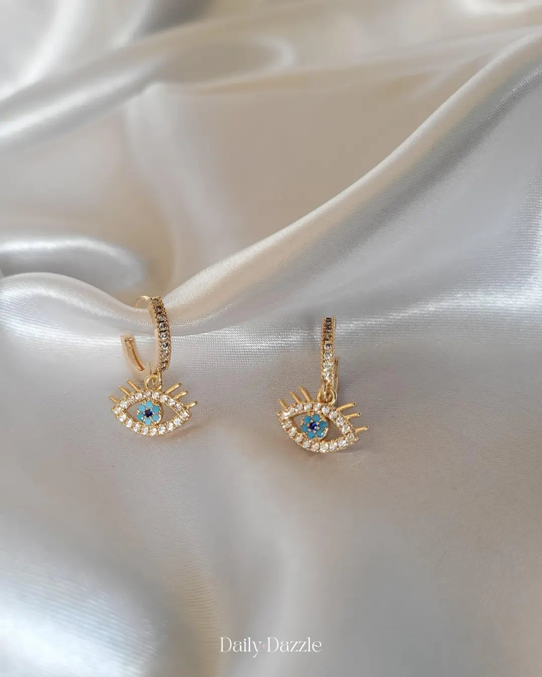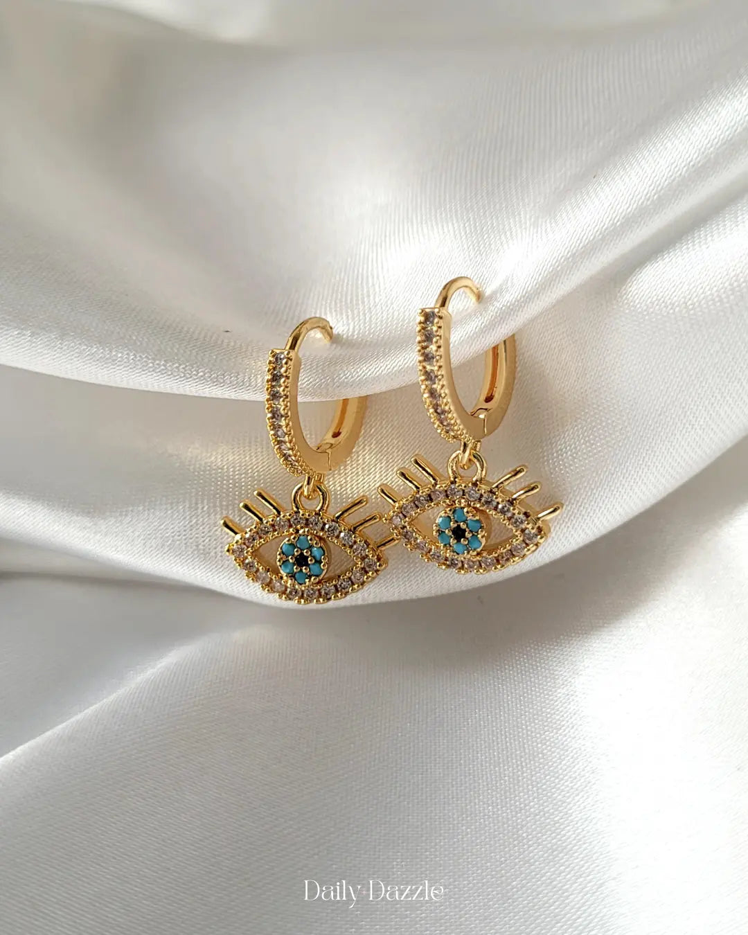Add a playful yet powerful touch to your look with our Evil Eye Charm Hoops — a symbol of protection and timeless style. These delicate 18K gold-plated hoops feature intricately designed evil eye charms, adorned with sparkling white stones and a pop of turquoise at the center. Perfect for warding off negativity while making a bold fashion statement.