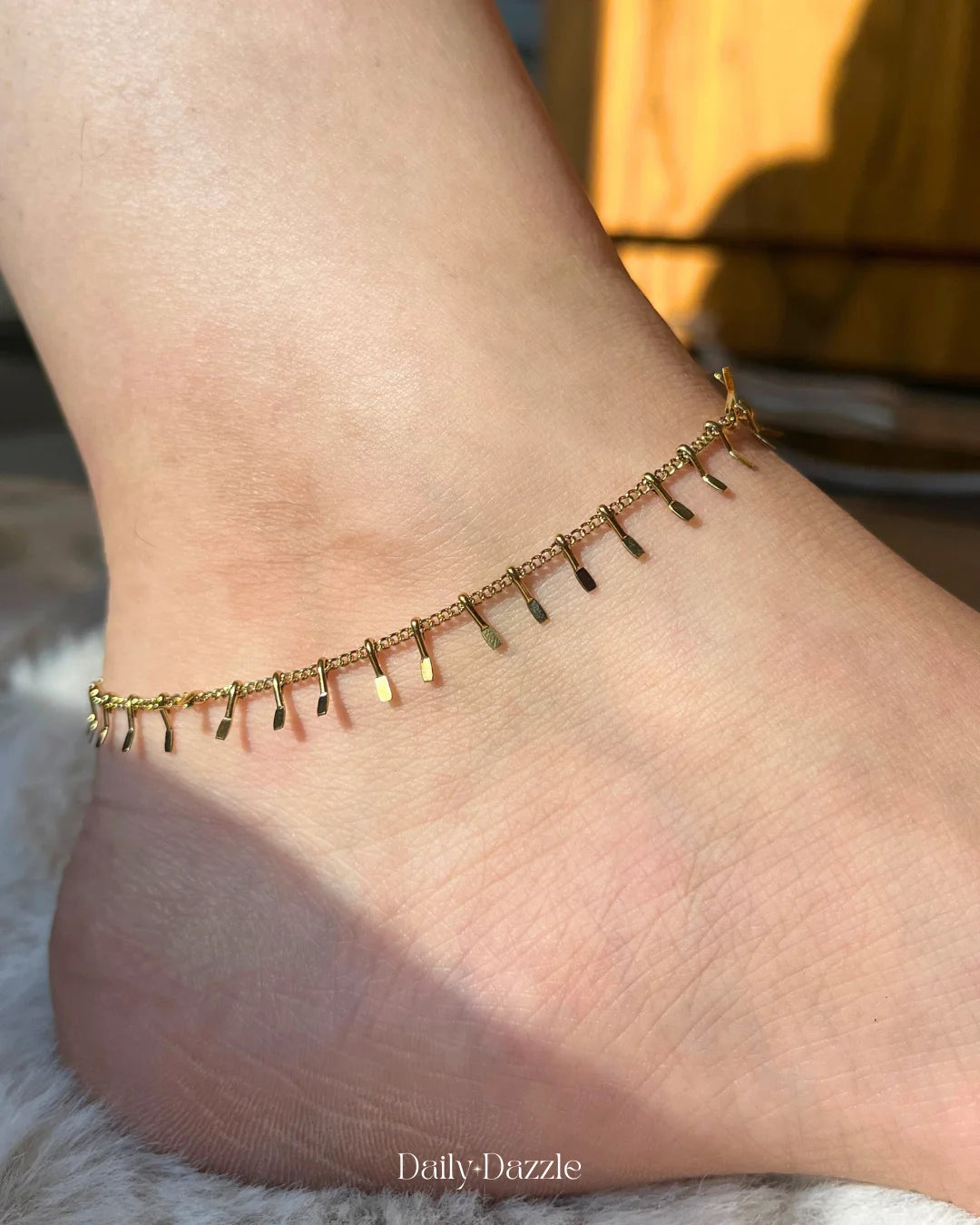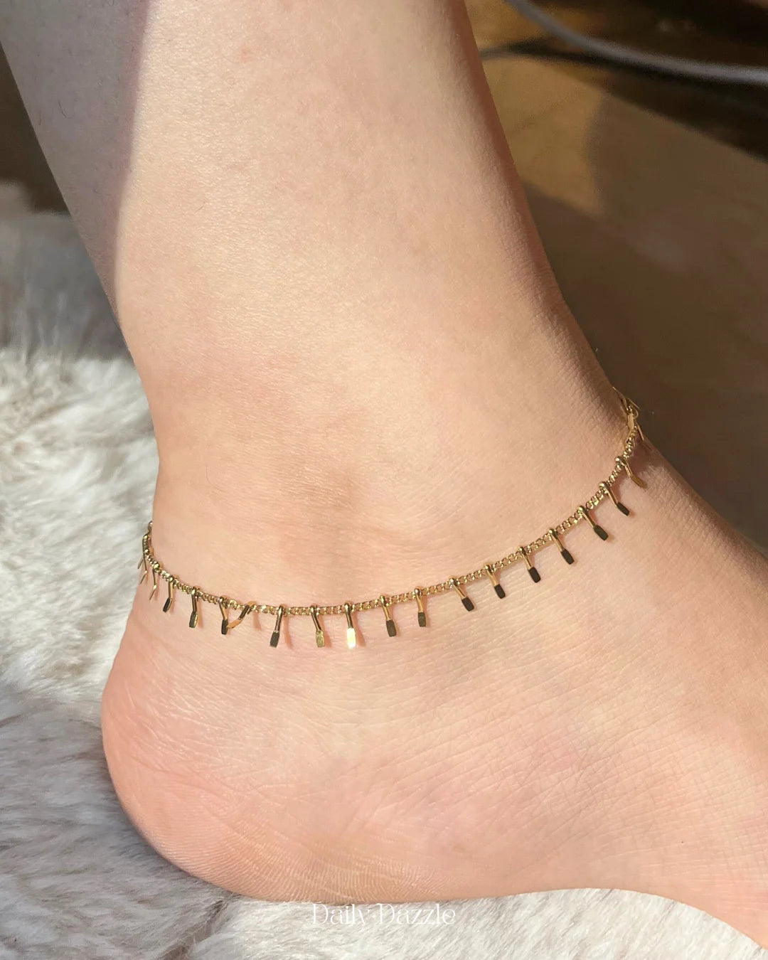 Step into elegance with our Golden Dazzle Anklet, crafted with 18K gold plating for a luxe finish. The delicate chain features dainty dangling accents that catch the light beautifully, adding a subtle yet stunning charm to your every move. Lightweight, elegant, and versatile—perfect for everyday wear, special occasions, and your beachy vacations.
