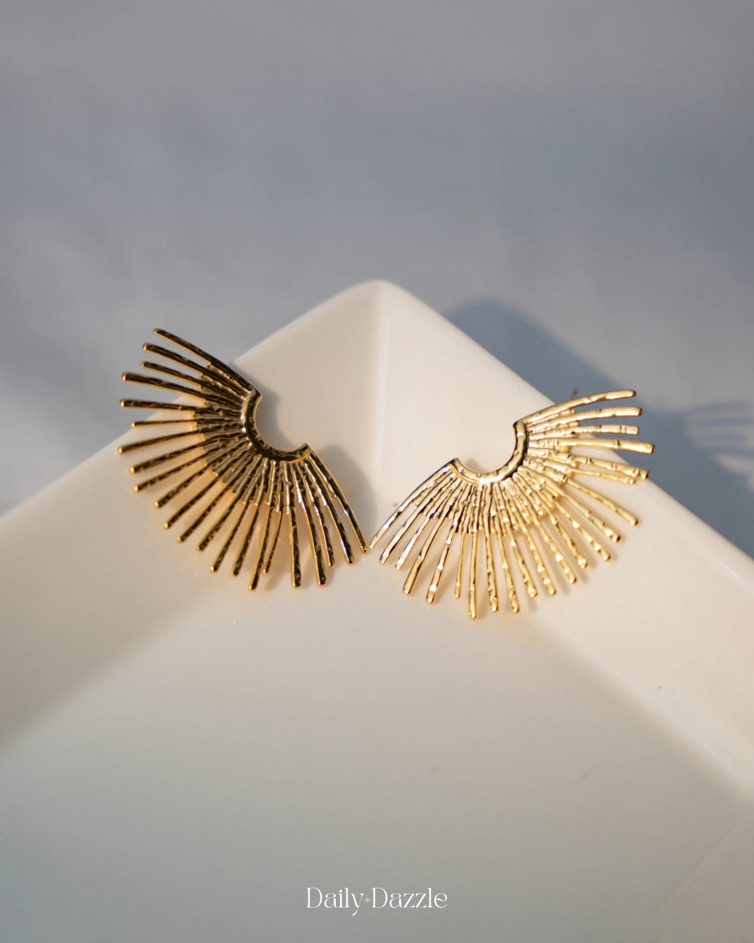 Make a striking statement with these 18K gold-plated, anti-tarnish earrings, inspired by the rays of the sun. With their intricate, fanned-out design, they bring a touch of bold elegance to any outfit, effortlessly blending modern style with timeless glamour.