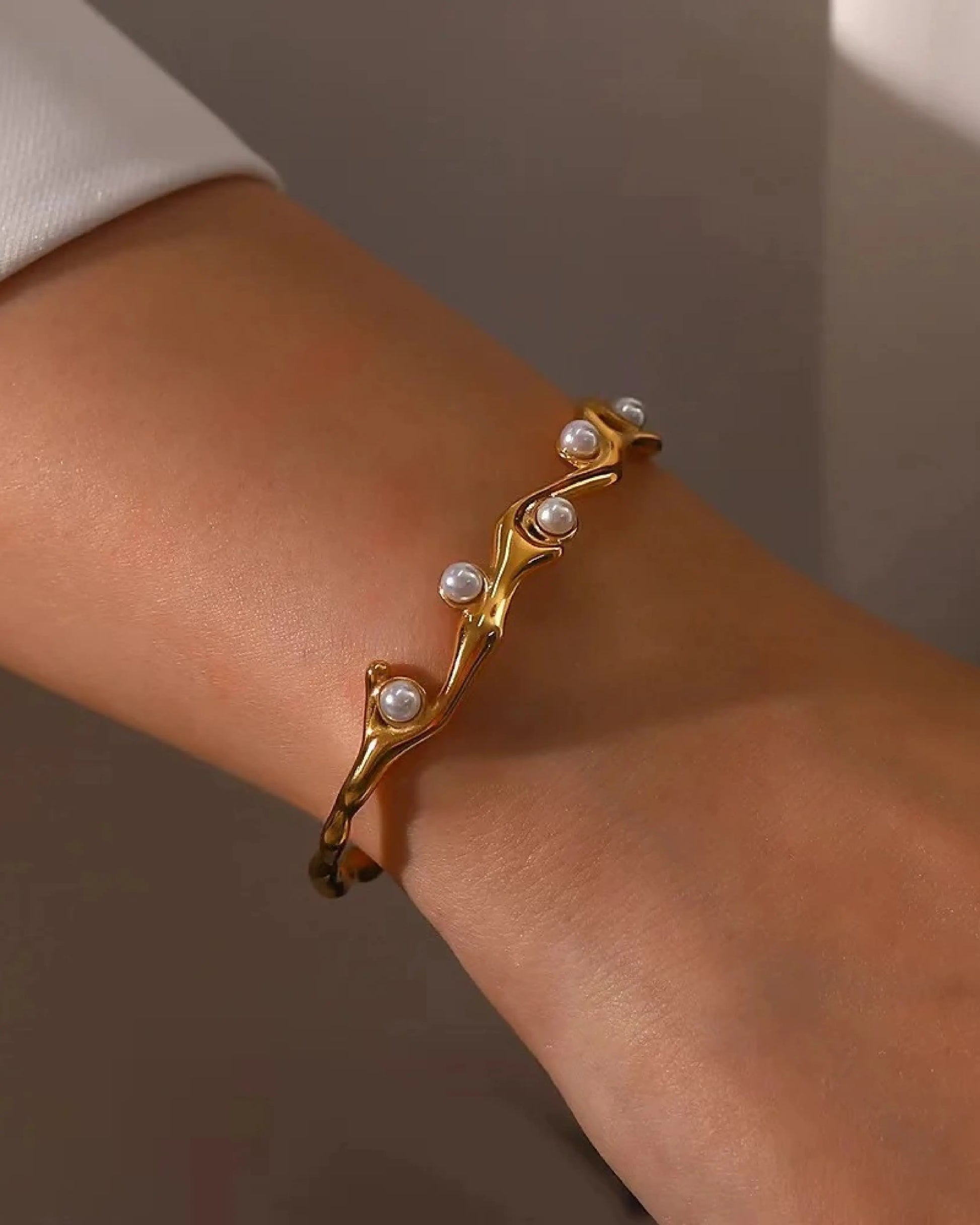 Inspired by nature’s elegance, this golden vine bracelet features delicate pearls resting on intricately designed gold branches, creating a timeless and ethereal look. Crafted with 18K gold plating, this piece is anti-tarnish and water-resistant, ensuring long-lasting shine.