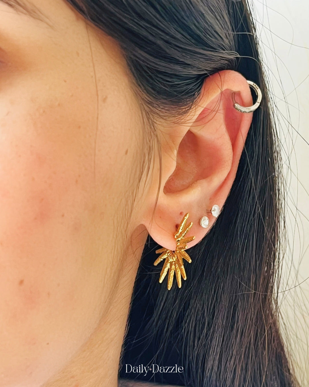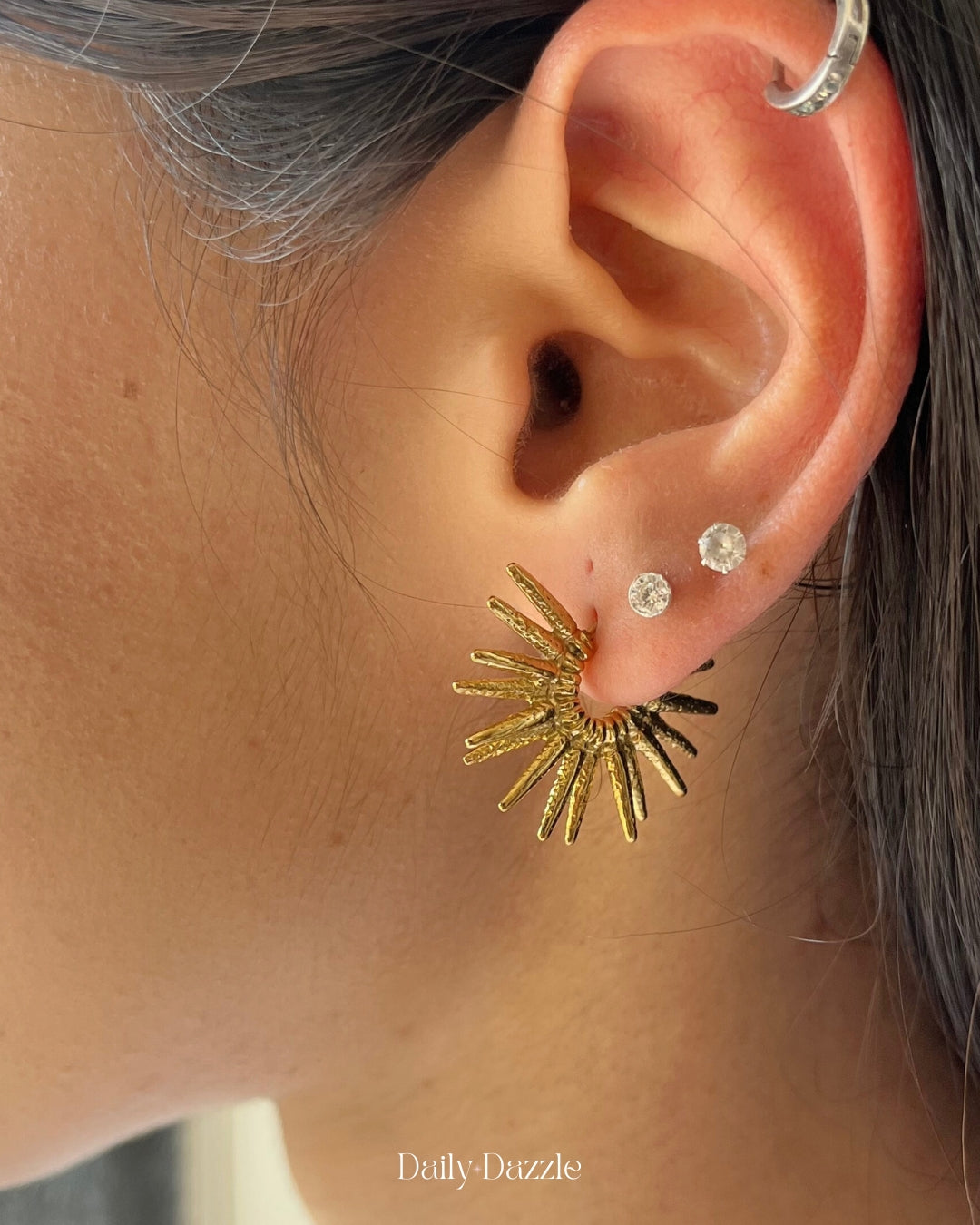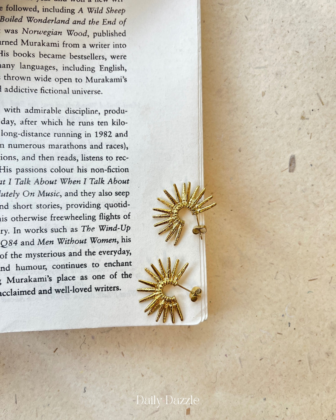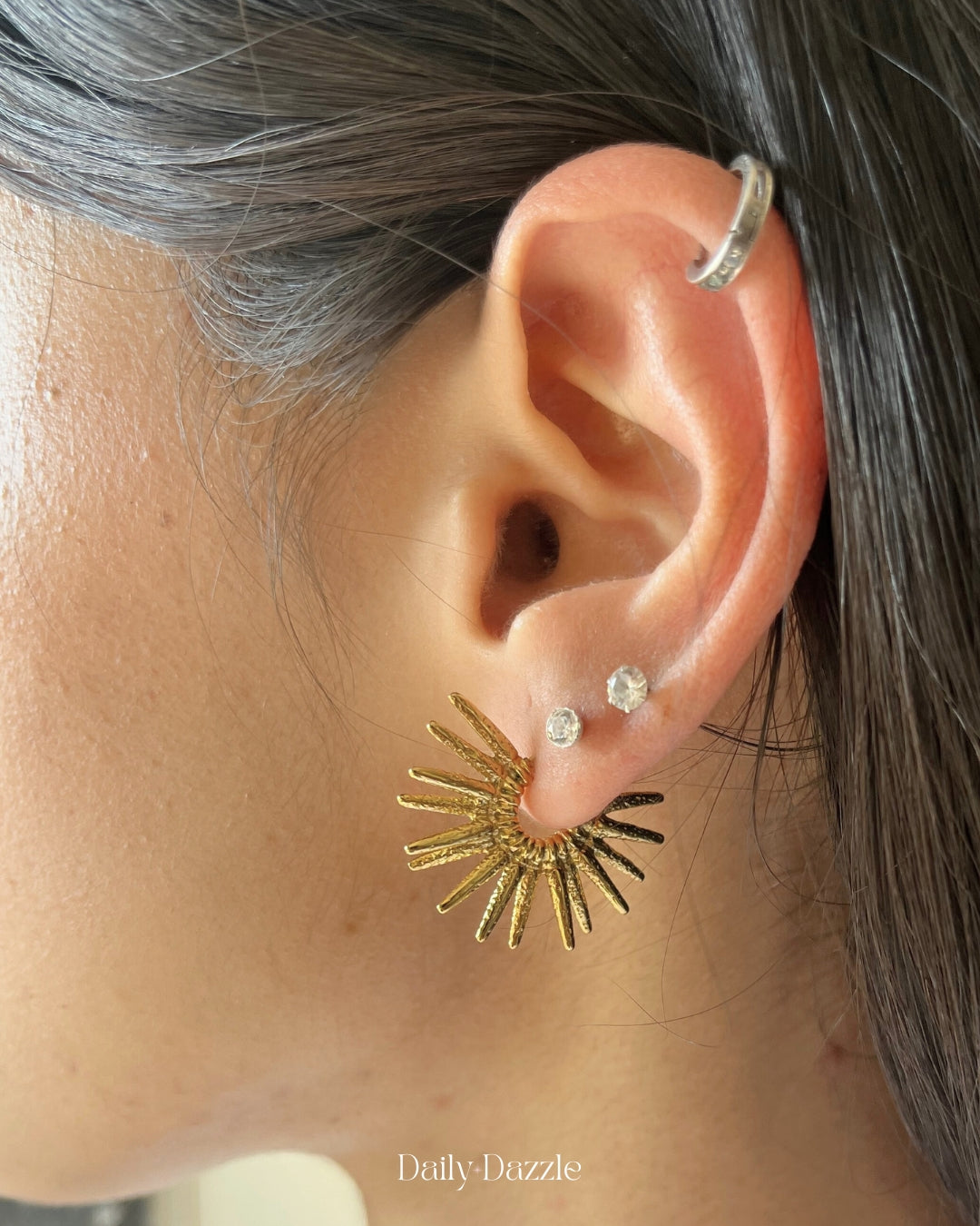 Bring a touch of sunshine to your style with our Goldflare Earrings. Designed with a striking sunburst pattern and finished with 18k gold plating, these earrings balance boldness with elegance — perfect for everyday wear or a standout look.