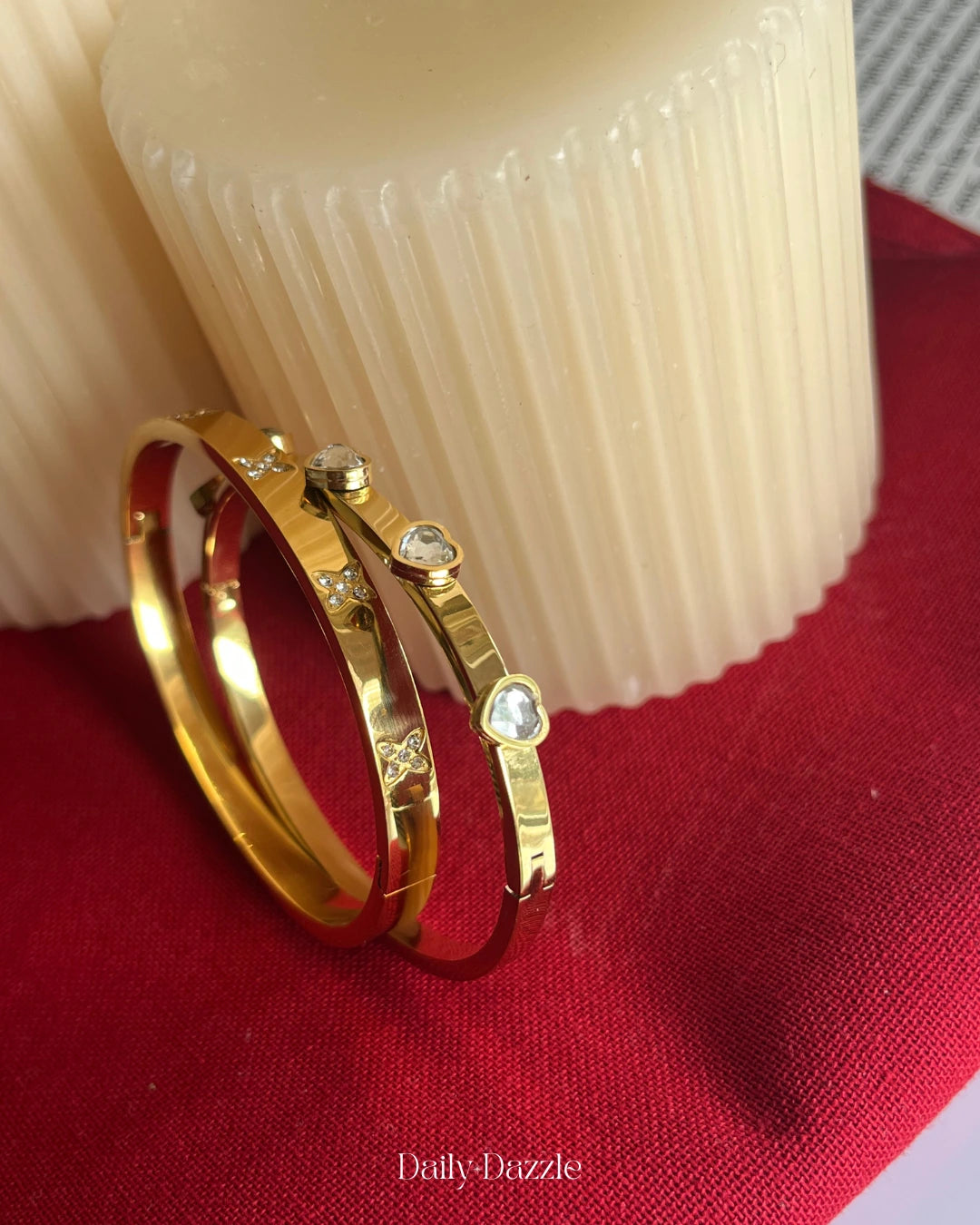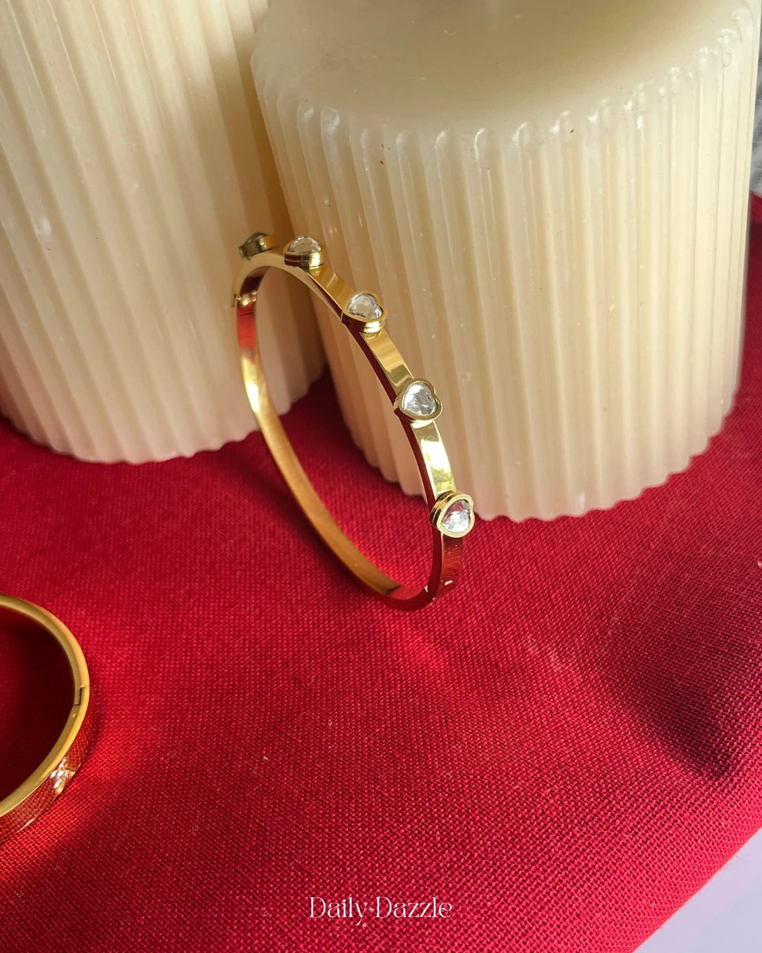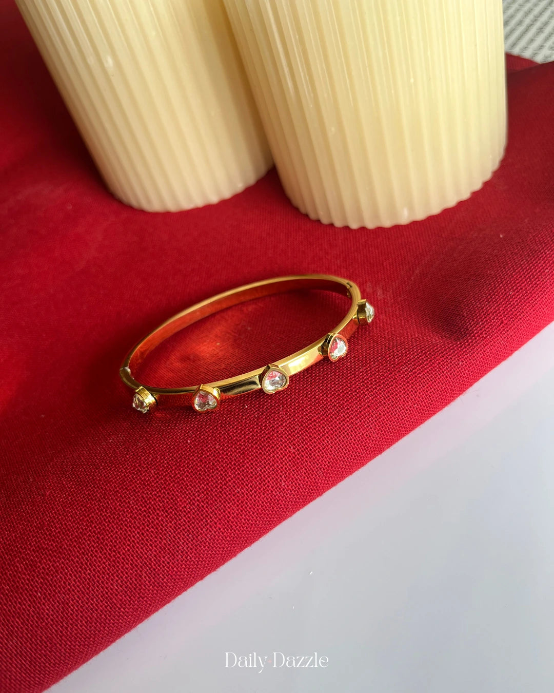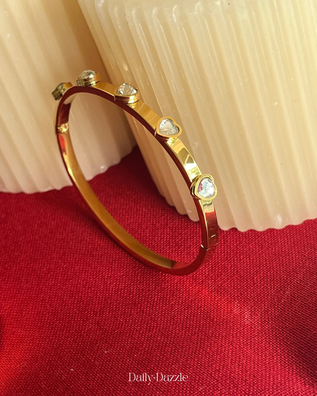 Romantic elegance meets everyday charm in our Heart Stone Openable Bangle. Crafted in a luxe 18K gold finish, this statement piece features shimmering heart-shaped stones that catch the light with every move. Designed with an openable clasp on the side for easy wear, it blends convenience with class — perfect for gifting or self-indulgence.