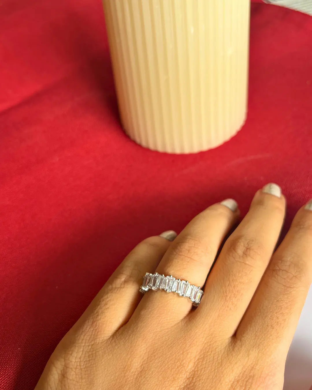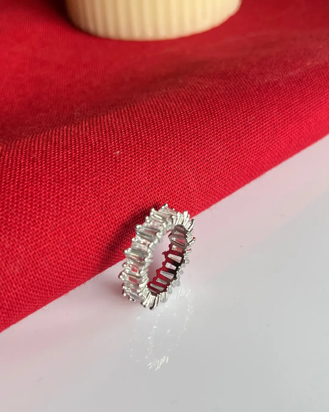 Bold. Brilliant. Unapologetically glam. The Ice Baguette Ring is a dazzling eternity band featuring a full circle of vertically set baguette-cut stones that shimmer from every angle. Its sleek silver-tone finish brings a cool, modern edge — perfect for stacking or making a statement solo.