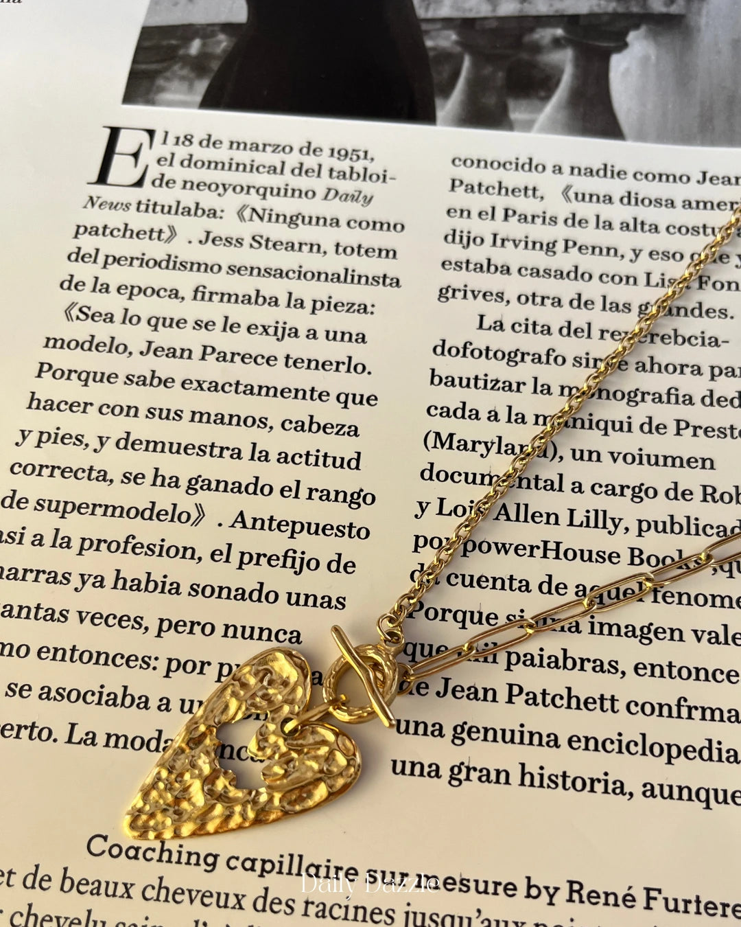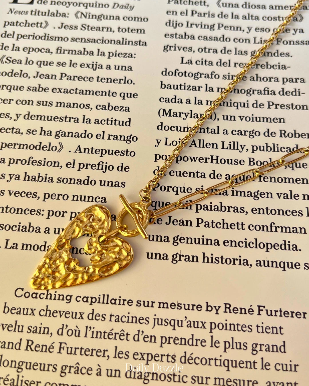 Melted with passion and purpose, the Molten Heart Necklace showcases a bold, openwork heart with a raw, hammered texture — evoking the fire of emotion and the beauty of imperfection. The unique toggle clasp and mixed chain links give it a chic, contemporary edge, making it a standout piece for those who wear their heart differently.