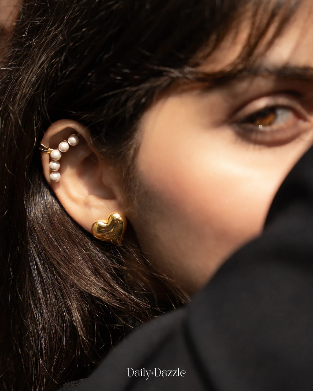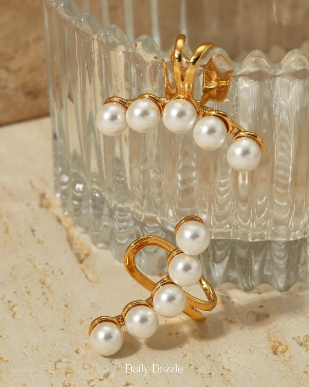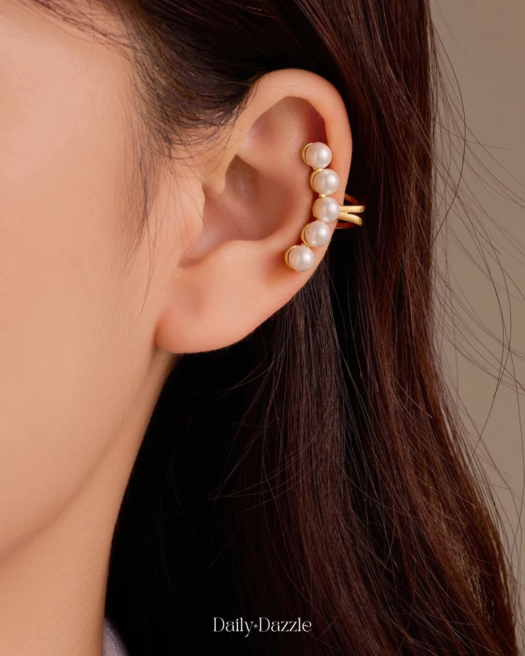 An exquisite blend of modern sophistication and timeless elegance, this 18K gold-plated, anti-tarnish ear cuff features a cascading row of luminous pearls that hug your ear effortlessly—no piercing required.