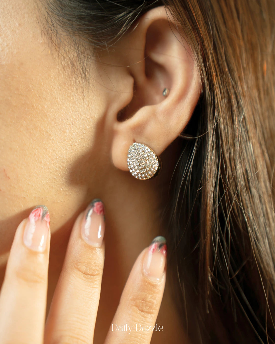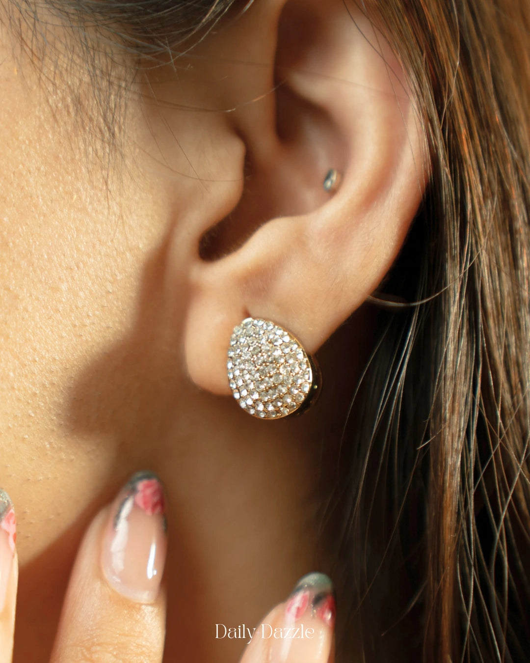 Shine bright with our Teardrop  Studs—where classic silhouette meets dazzling shimmer. These elegant earrings feature a bold teardrop shape encrusted with pavé-set cubic zirconia, catching the light from every angle. Crafted with an anti-tarnish 18K gold-plated base, they offer both durability and luxe appeal for your everyday glam or evening glow-up.