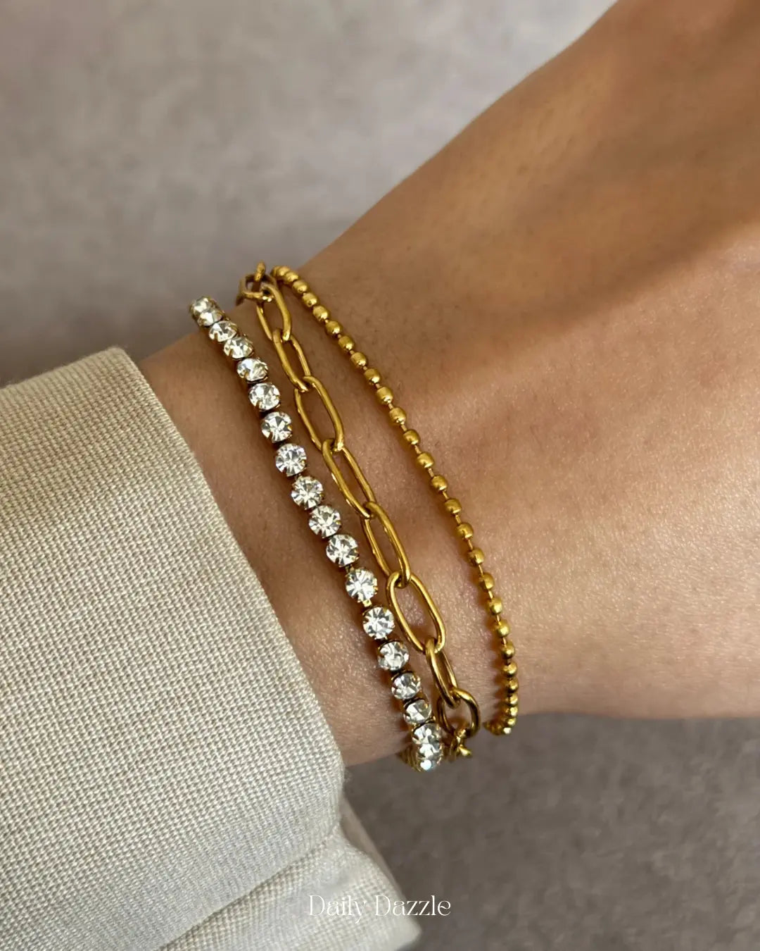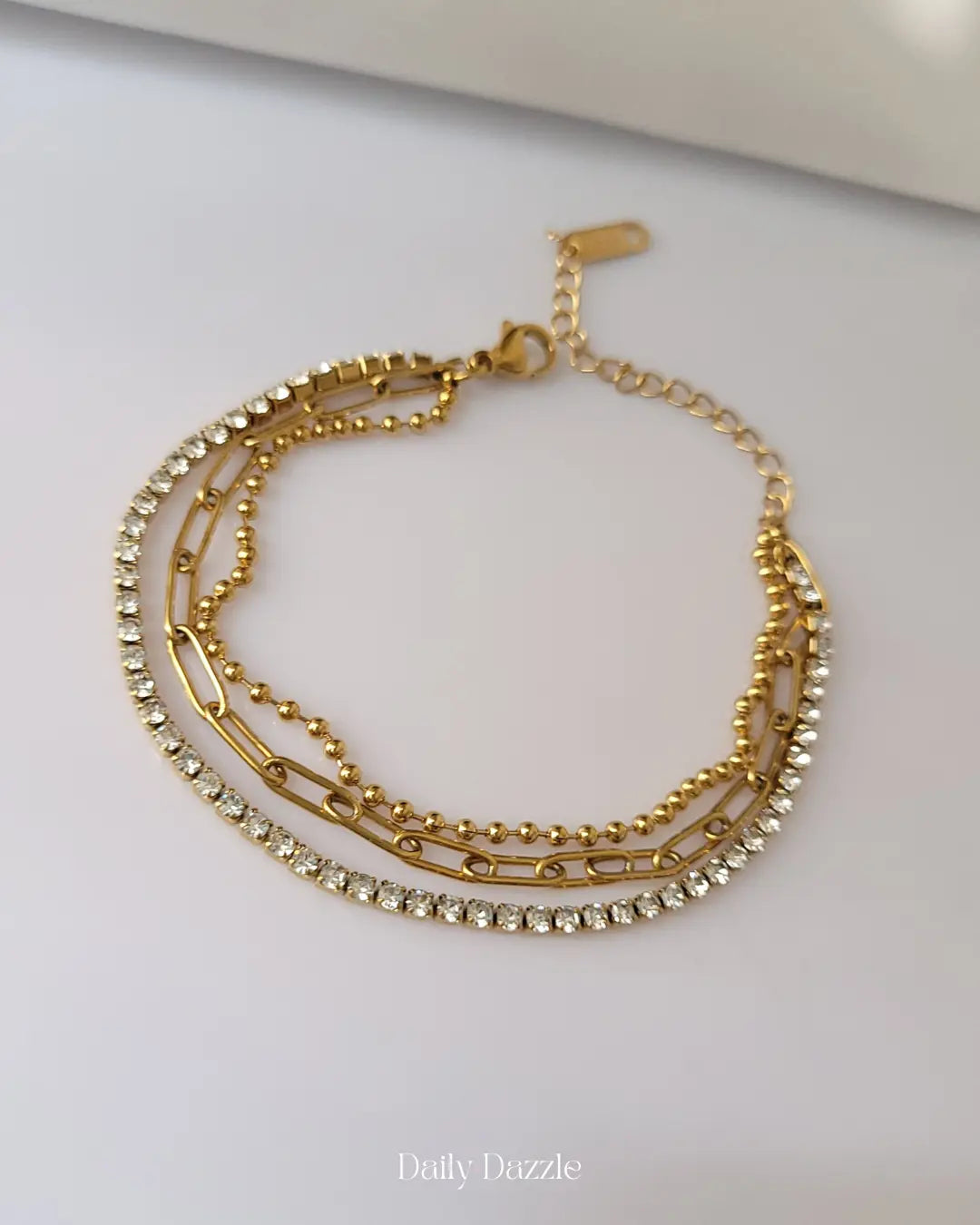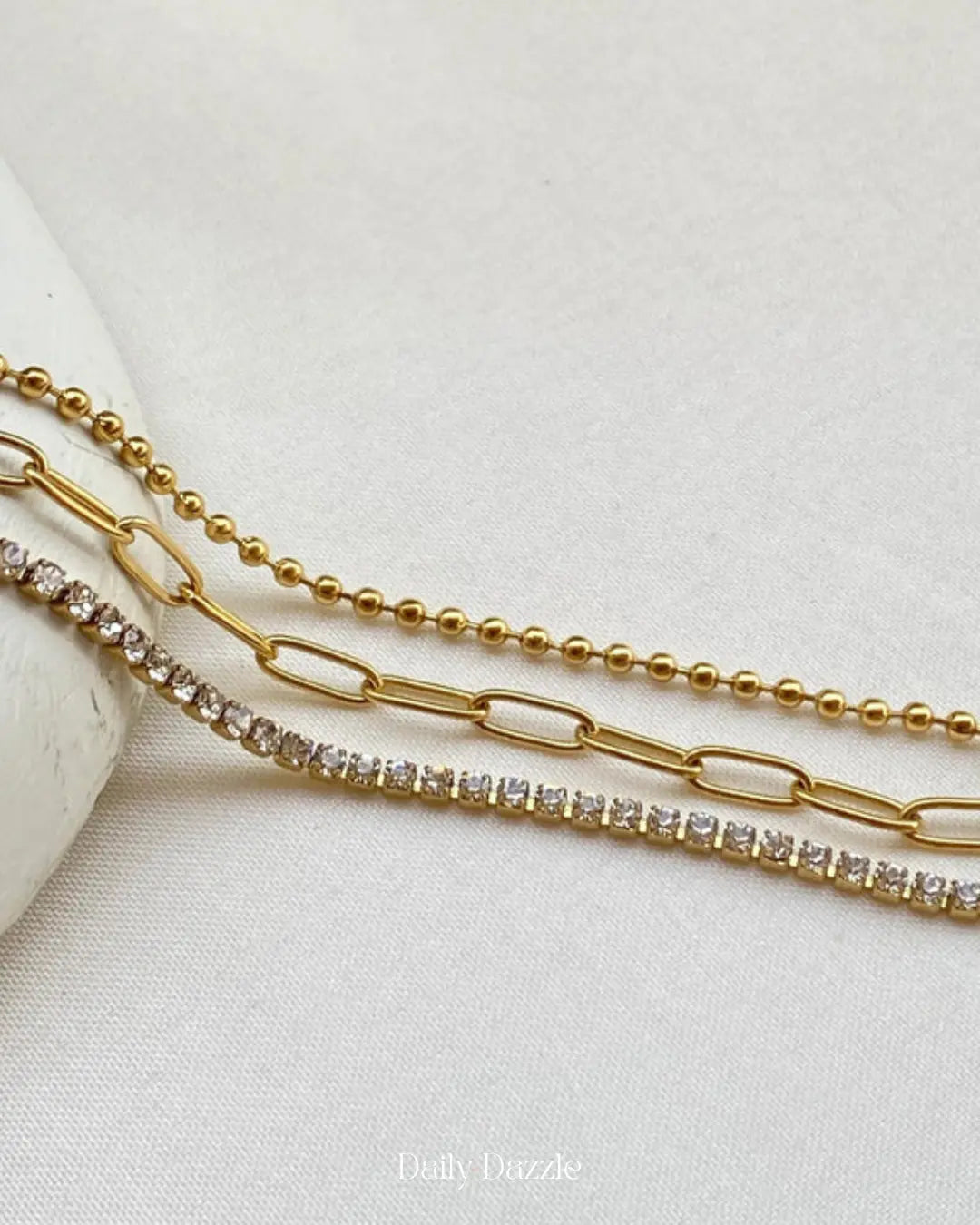 Chic, versatile, and effortlessly stylish — the Triple Layer Bracelet brings together three unique gold-toned chains in one elegant piece. Featuring a crystal-studded strand, a sleek paperclip link, and a delicate beaded chain, this bracelet is your all-in-one wrist stack. Made with 18K gold plating and an anti-tarnish finish for long-lasting shine.