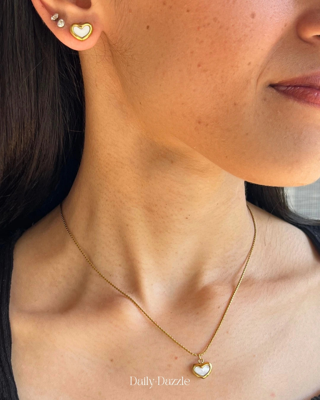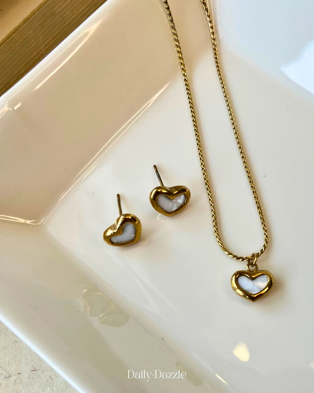 Soft, elegant, and timeless — this heart-shaped necklace and stud earring set captures the essence of everyday romance. With a polished 18k gold-plated frame and delicate white enamel heart, it’s the perfect balance of charm and sophistication.